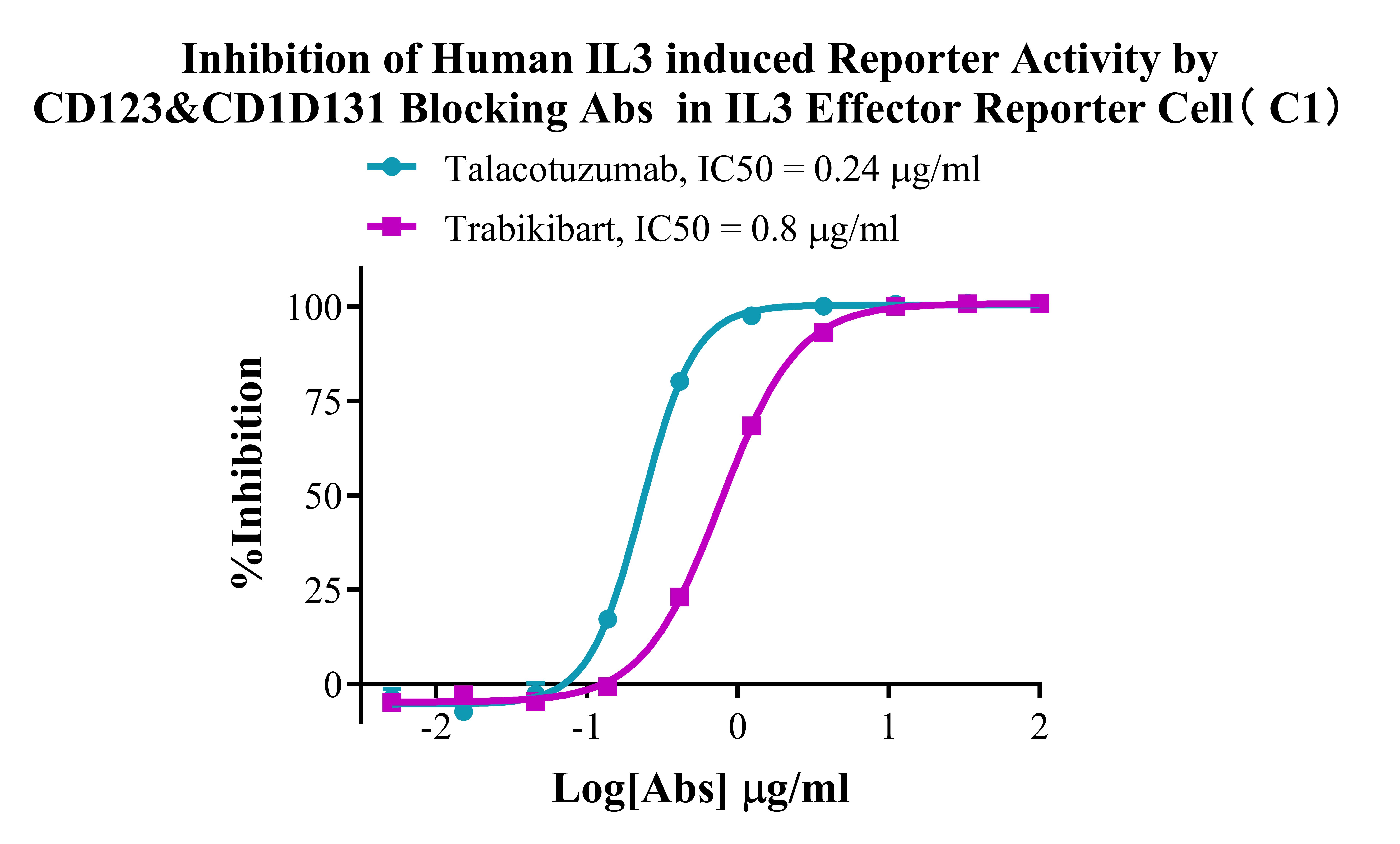 Figure 4. Inhibition of Human IL3 induced Reporter Activity by CD123&CD1D131 Blocking Abs in IL3 Effector Reporter Cell(C1).