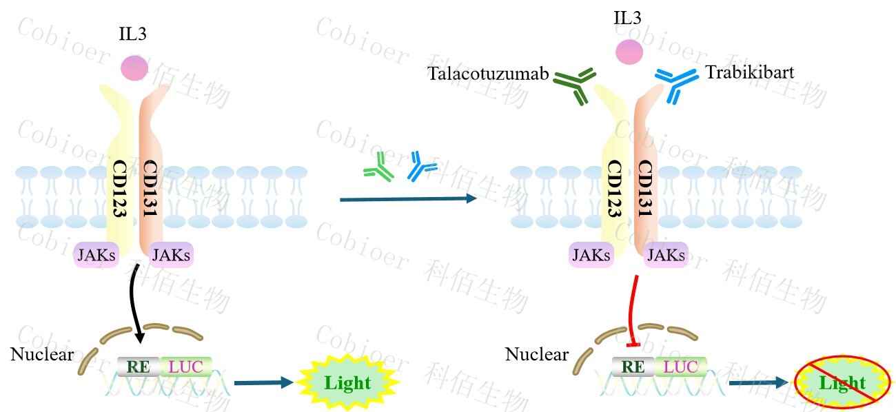 IL3 Effector Reporter Cell 報(bào)告基因藥靶模型很好的模擬了體內(nèi) IL3 的信號(hào)轉(zhuǎn)導(dǎo)過程,原理見下圖所示。