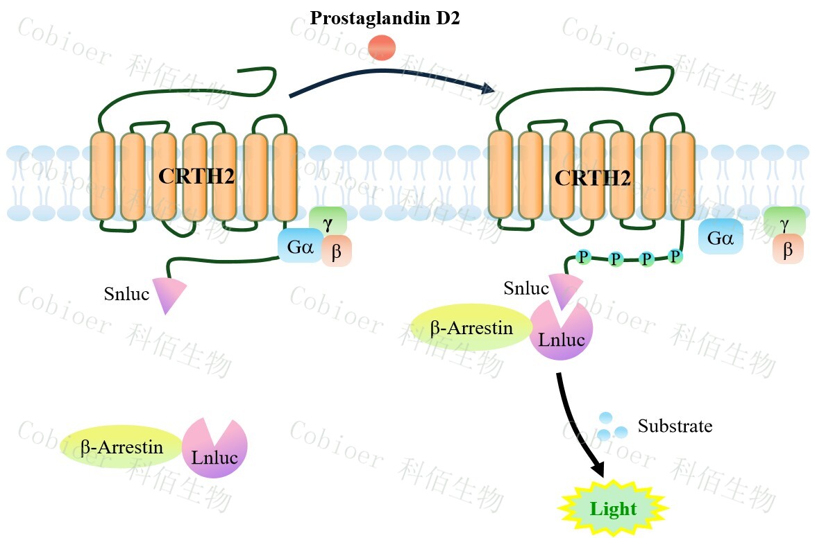 CRTH2(DP2) β-Arrestin CHO 報(bào)告基因藥靶模型很好的模擬了體內(nèi) CRTH2(DP2)/β- Arrestin 的信號(hào)轉(zhuǎn)導(dǎo)過(guò)程, 原理見下圖所示。 當(dāng)缺乏配體刺激時(shí) , β-Arrestin 不與 CRTH2(DP2)結(jié)合,融合β-Arrestin 的熒光素酶處于失活構(gòu)象,當(dāng) CRTH2(DP2)遭遇配體刺 激時(shí),融合熒光素酶報(bào)告基因的β-Arrestin 被招募,使熒光素酶報(bào)告基因處于激活狀態(tài),加 入其底物后發(fā)光信號(hào)增強(qiáng)。![]() Figure 1. CRTH2(DP2) β-Arrestin CHO 細(xì)胞模型原理圖 |