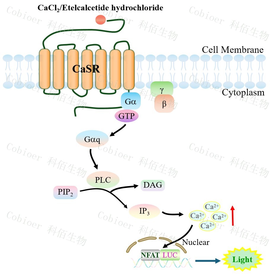 CaSR NFAT-Luc HEK293 細胞藥靶模型很好的模擬了體內(nèi) CaSR 的信號轉導過程,原 理見下圖所示。![]() Figure 1. CaSR NFAT-Luc HEK293 細胞模型原理圖 |