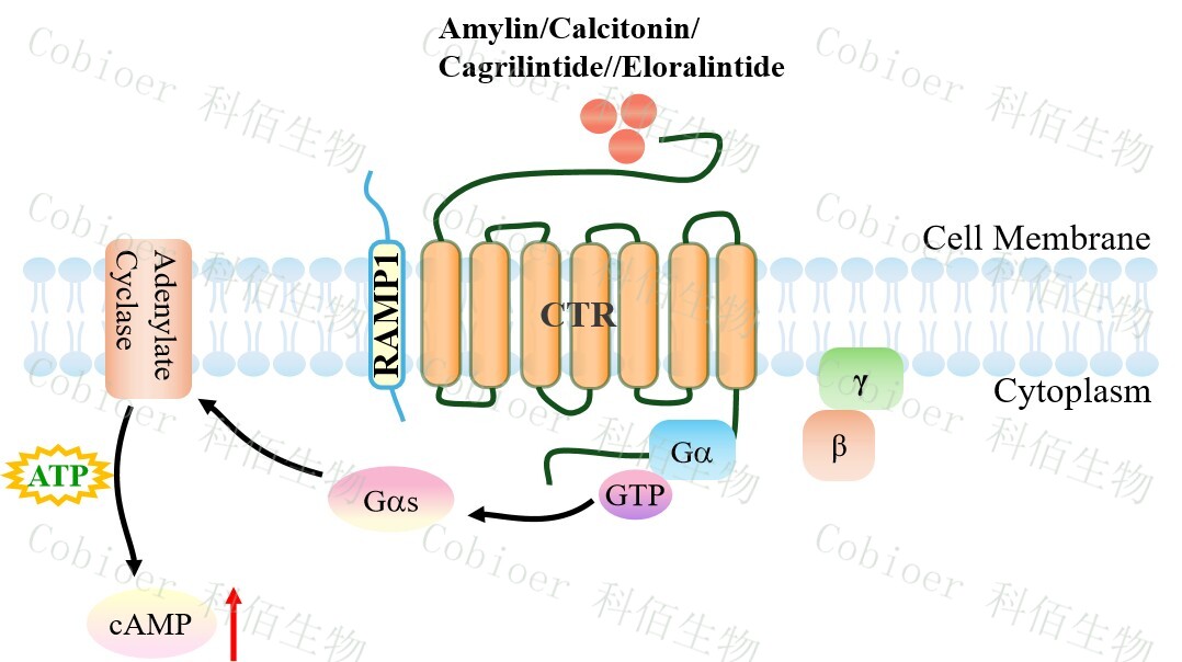 胰淀素(Amylin)受體的三種類型的已被確定,即 AMY1,AMY2 和 AMY3。胰淀素 受體屬于 B 類 GPCR,是異二聚體復合物,由降鈣素受體(CTR)與受體活性修飾蛋白 (RAMPs)結合形成。該受體的 CTR 組分具有相同的 GPCR 結構:7 個跨膜相互連接的α- 螺旋,將細胞外信號傳遞到細胞內細胞質信號級聯(lián)。RAMP 有三種類型(RAMP1、 RAMP2 和 RAMP3),它們共享 31%的氨基酸序列,具有相似的基本結構。RAMP 是將 CTR 轉運到細胞膜并調節(jié)其配體特異性的重要肽,它可以改變特定 GPCR 的藥理學、功能 和細胞運輸。