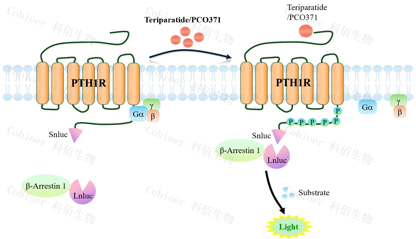PTH1R β-Arrestin 1 CHO 報告基因藥靶模型很好的模擬了體內(nèi) PTH1R/β-Arrestin 1 的信號轉(zhuǎn)導(dǎo)過程,原理見下圖所示。當缺乏配體刺激時,β-Arrestin 1 不與 PTH1R 結(jié)合,融合β- Arrestin 1 的熒光素酶處于失活構(gòu)象,當 PTH1R 遭遇配體刺激時,融合熒光素酶報告基因 的β-Arrestin 1 被招募,使熒光素酶報告基因處于激活狀態(tài),加入其底物后發(fā)光信號增強。![]() Figure 1. PTH1R β-Arrestin 1 CHO 細胞模型原理圖 |