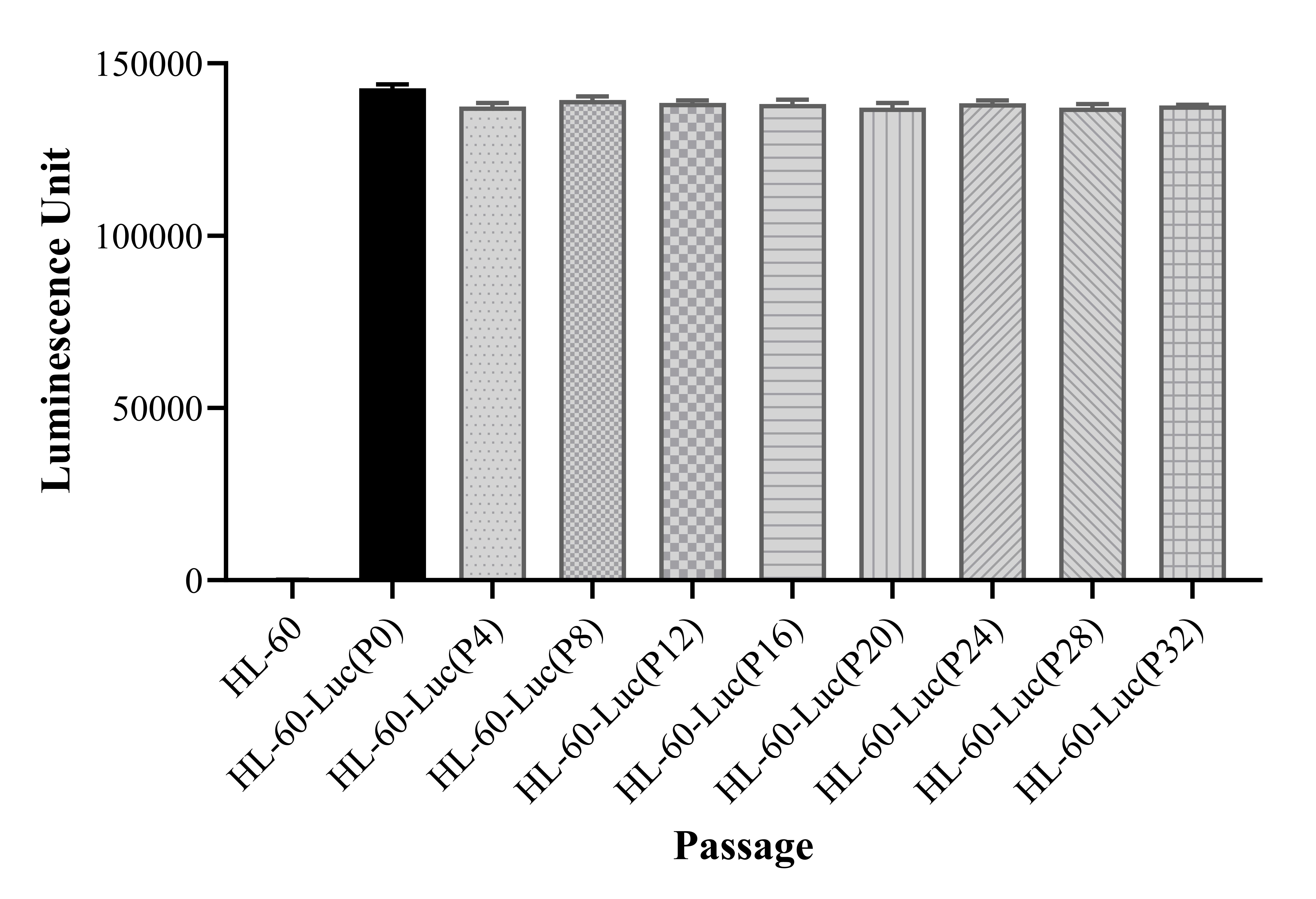 Figure 1. Stablity test results. HL-60-Luc showed at least 32 passage stability with similar luminescence unit. |