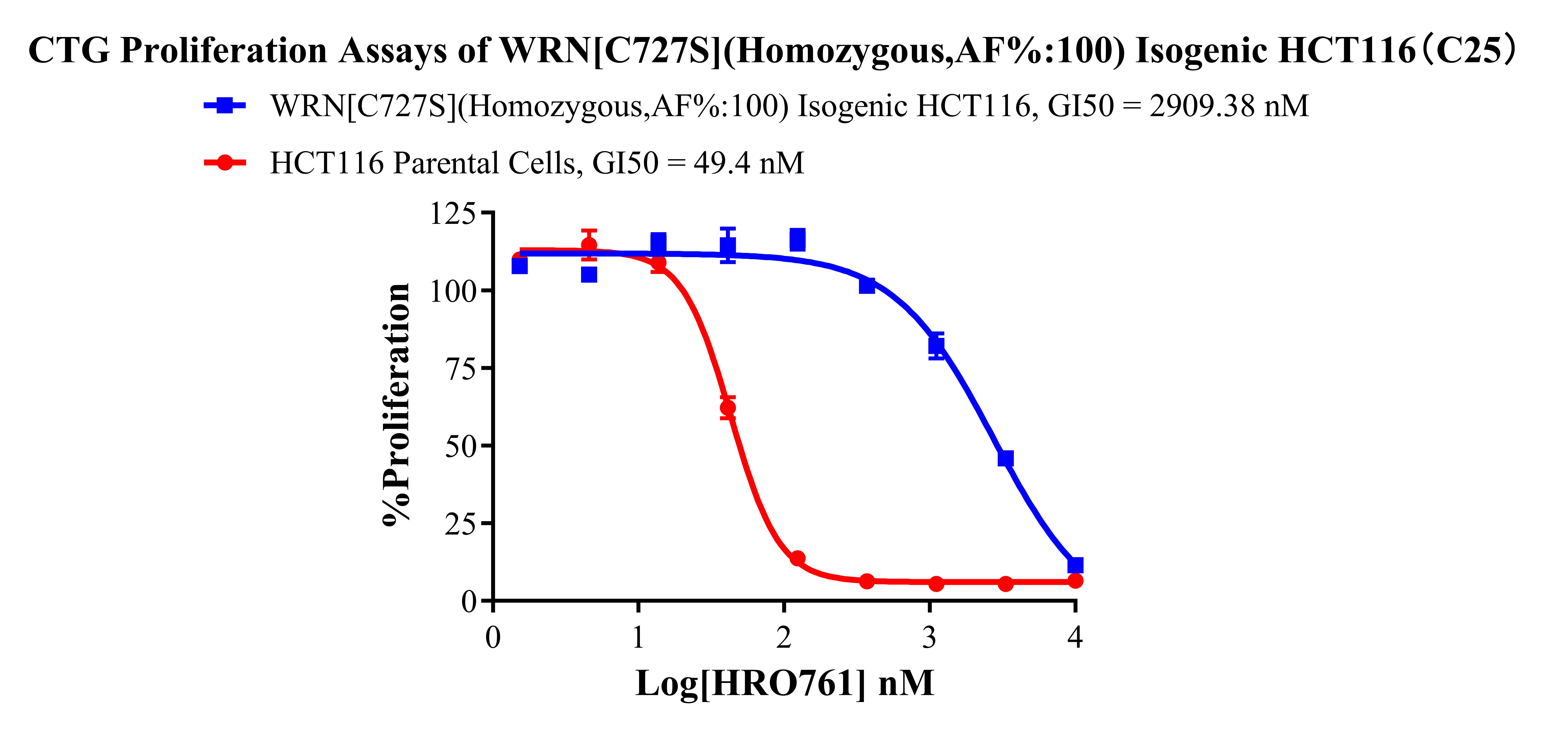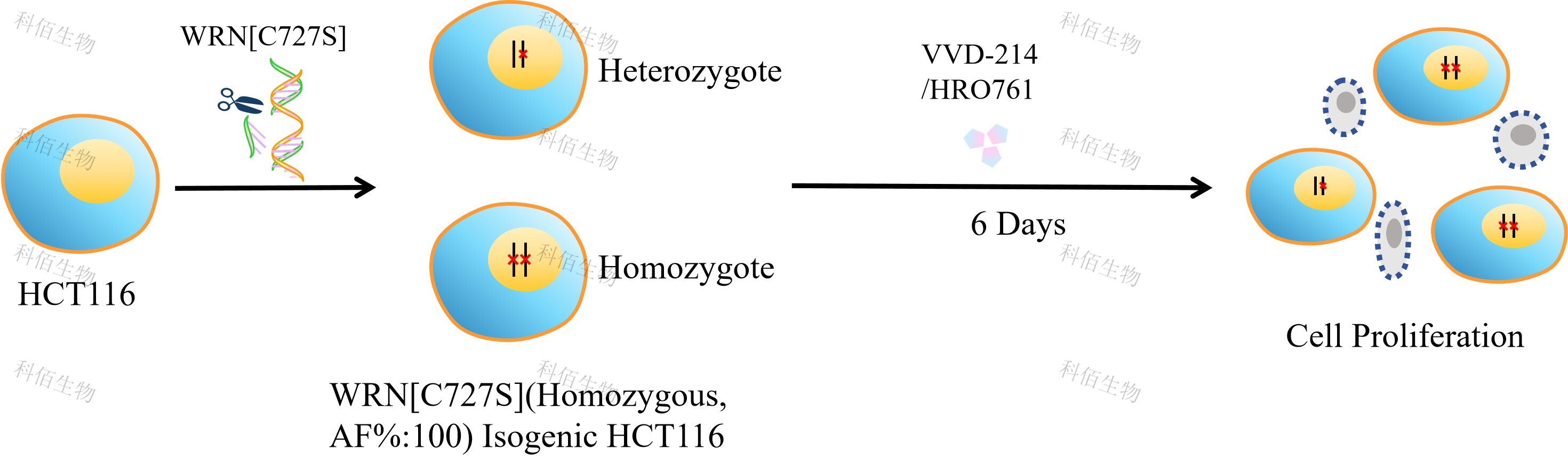 WRN[C727S](Homozygous,AF%:100) Isogenic HCT116 藥靶細(xì)胞,通過(guò)基因編輯的方式將 WRN 的 727 位氨基酸胱氨酸(C)突變?yōu)榻z氨酸(S)。![]() Figure 1. WRN[C727S](Homozygous,AF%:100) Isogenic HCT116 原理示意圖 |