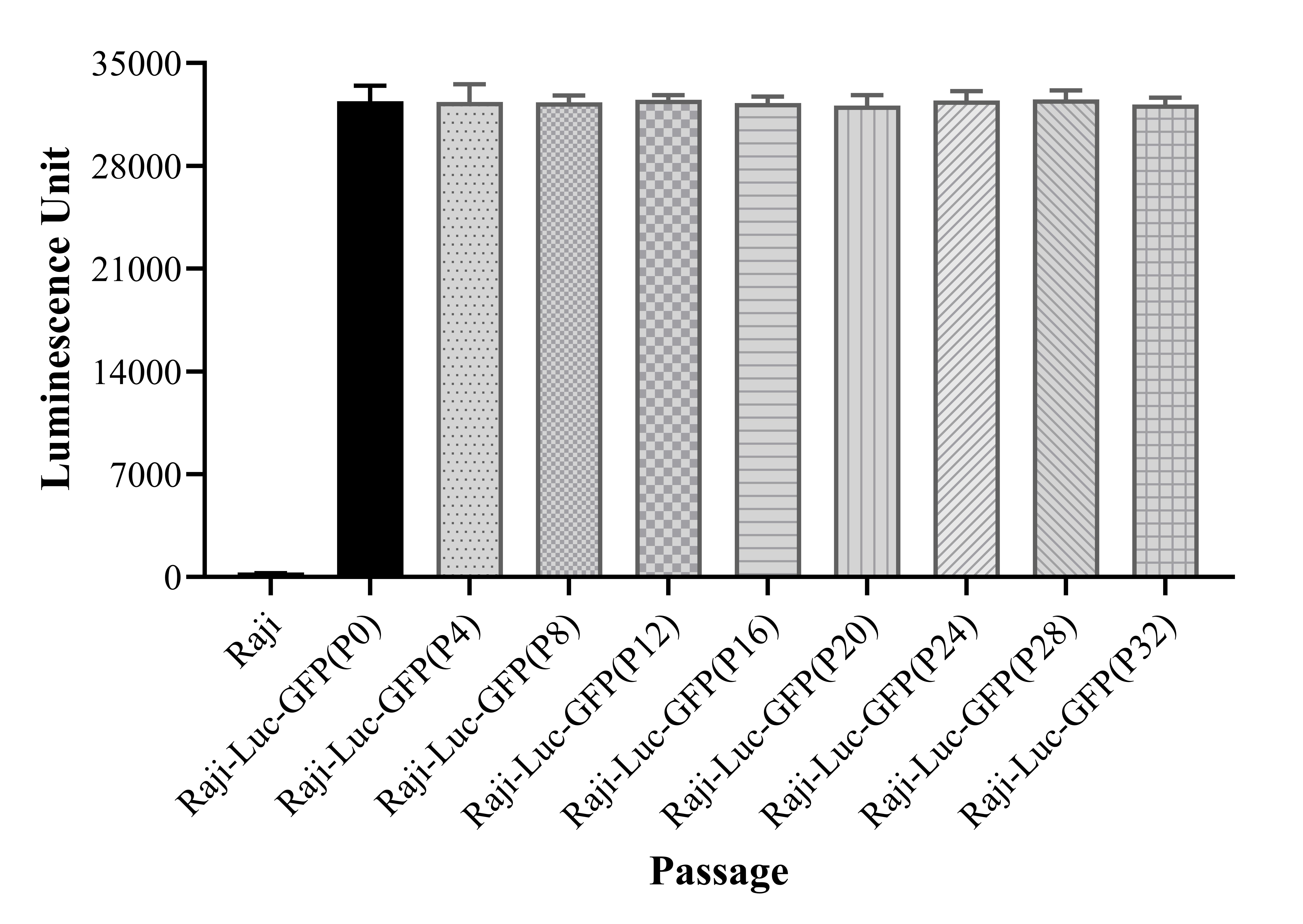 Figure 2. Stablity test results. Raji-Luc-GFP showed at least 32 passage stability with similar luminescence unit.