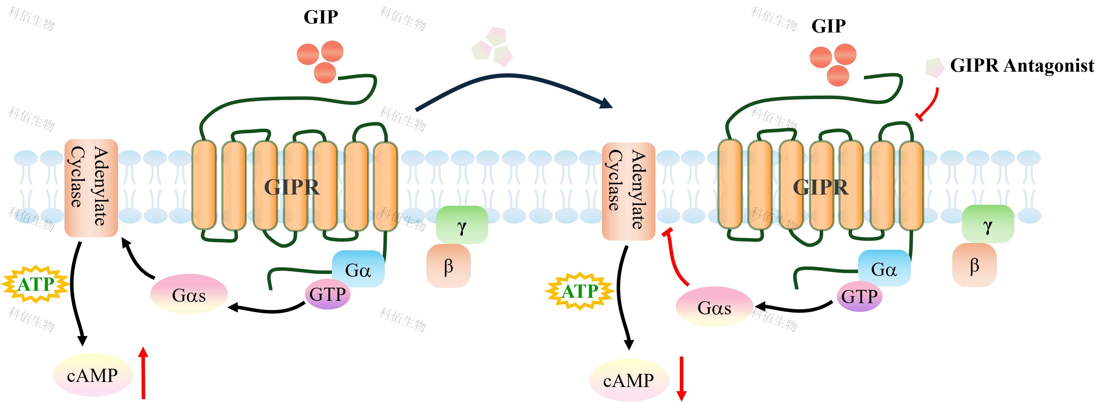 葡萄糖依賴性胰島素促泌多肽(又稱抑胃肽,GIP)、胰高血糖素樣肽-1(GLP-1)和 胰高血糖素(GCG)是負(fù)責(zé)葡萄糖穩(wěn)態(tài)的肽激素。它們的同源受體GIPR、GLP-1R和 GCGR屬于B1類GPCR家族。胃抑制多肽受體(GIPR)是GIP的受體,是一種具有7個(gè) 跨膜結(jié)構(gòu)域的G蛋白偶聯(lián)受體。它與GIP激素結(jié)合,以葡萄糖誘導(dǎo)的方式增強(qiáng)胰腺β細(xì)胞 胰島素的合成和分泌。胰腺β細(xì)胞上的GIPR在信號(hào)級(jí)聯(lián)中起著關(guān)鍵作用,導(dǎo)致血糖水平 升高時(shí)胰島素釋放。