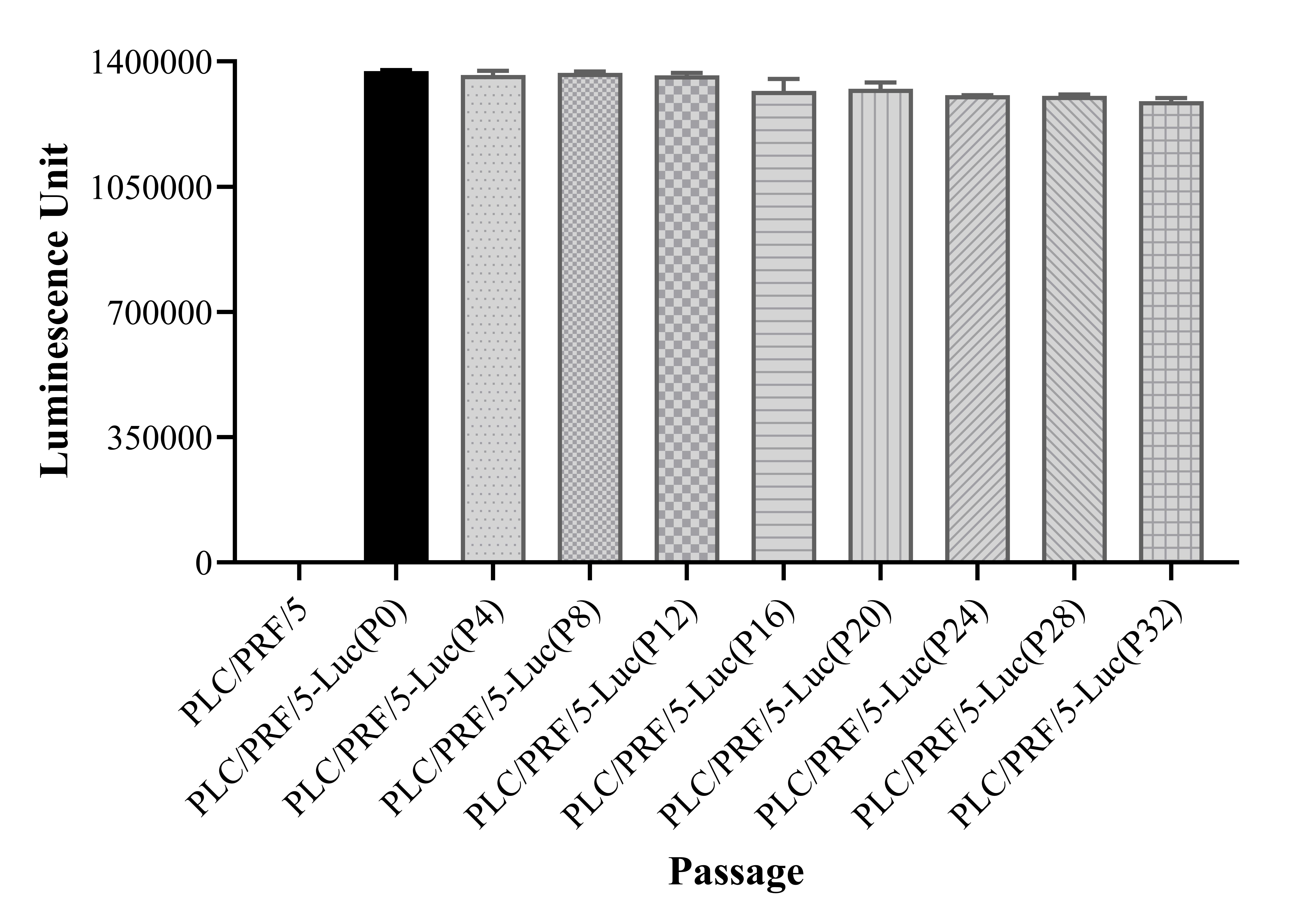 Figure 1. Stablity test results. PLC/PRF/5-Luc showed at least 32 passage stability with similar luminescence unit.