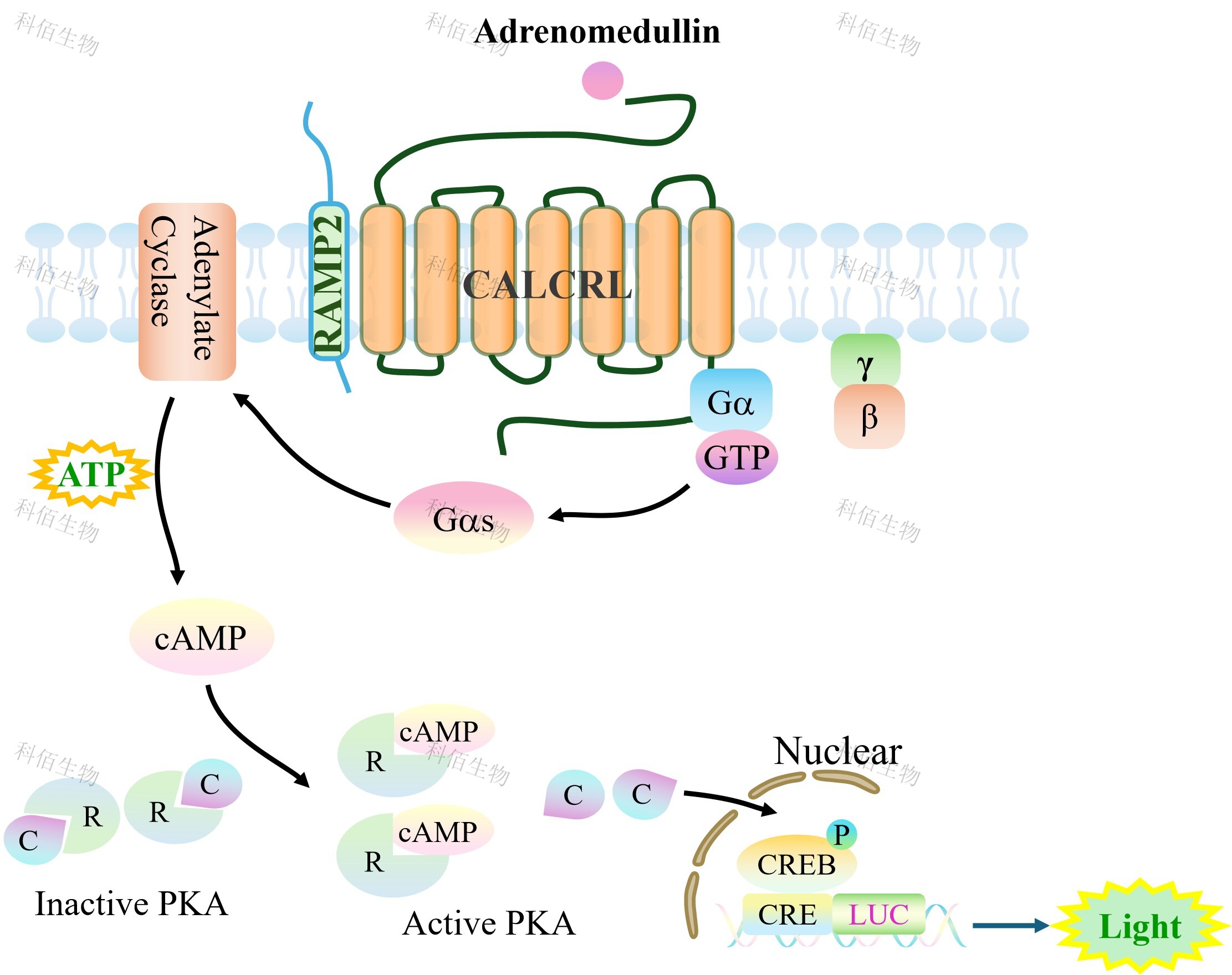 CALCRL&RAMP2 CRE-Luc HEK293 報告基因靶模型很好的模擬了體內 Adrenomedullin 的信號轉導過程,原理見下圖所示。