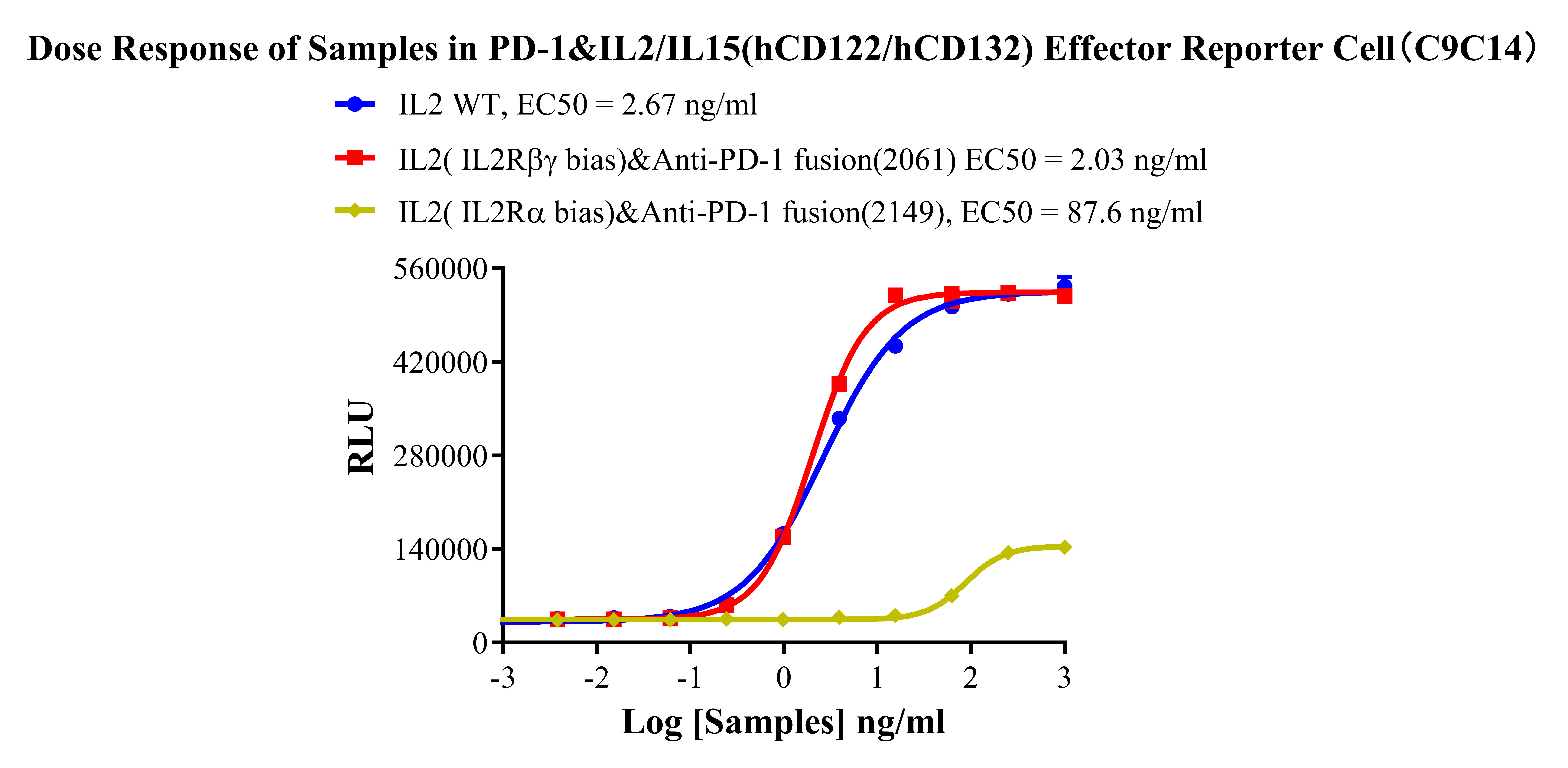 Figure 2. Dose Response of Samples in PD-1&IL2/IL15(hCD122/hCD132) Effector Reporter Cell(C9C14).