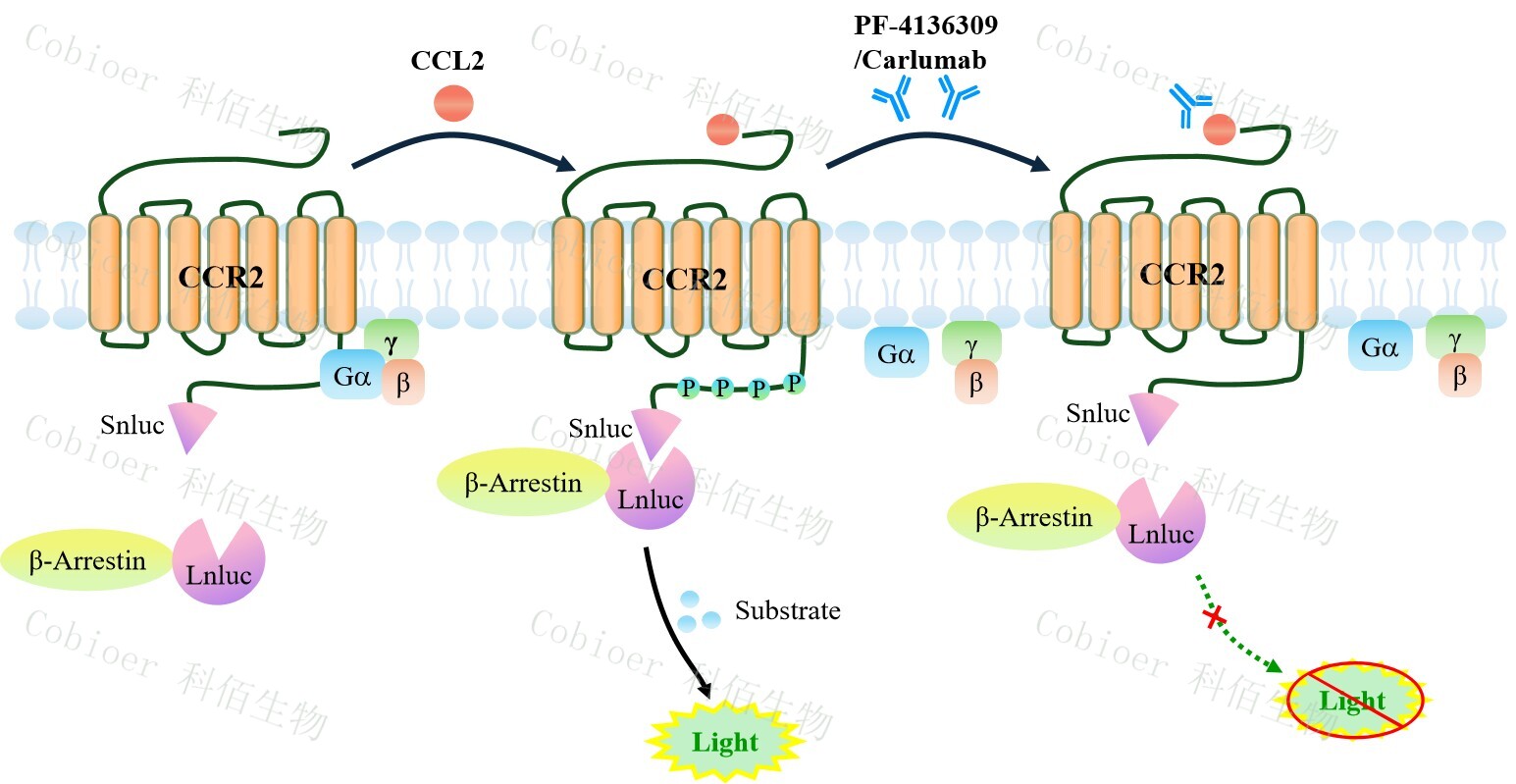 CCR2 β-Arrestin CHO 報告基因藥靶模型很好的模擬了體內(nèi) CCR2/β-Arrestin 的信號轉(zhuǎn) 導過程,原理見下圖所示。當缺乏配體刺激時,β-Arrestin 不與 CCR2 結(jié)合,融合β-Arrestin 的熒光素酶處于失活構(gòu)象,當 CCR2 遭遇配體刺激時,融合熒光素酶報告基因的β-Arrestin 被招募,使熒光素酶報告基因處于激活狀態(tài),加入其底物后發(fā)光信號增強。![]() Figure 1. CCR2 β-Arrestin CHO 細胞模型原理圖 |