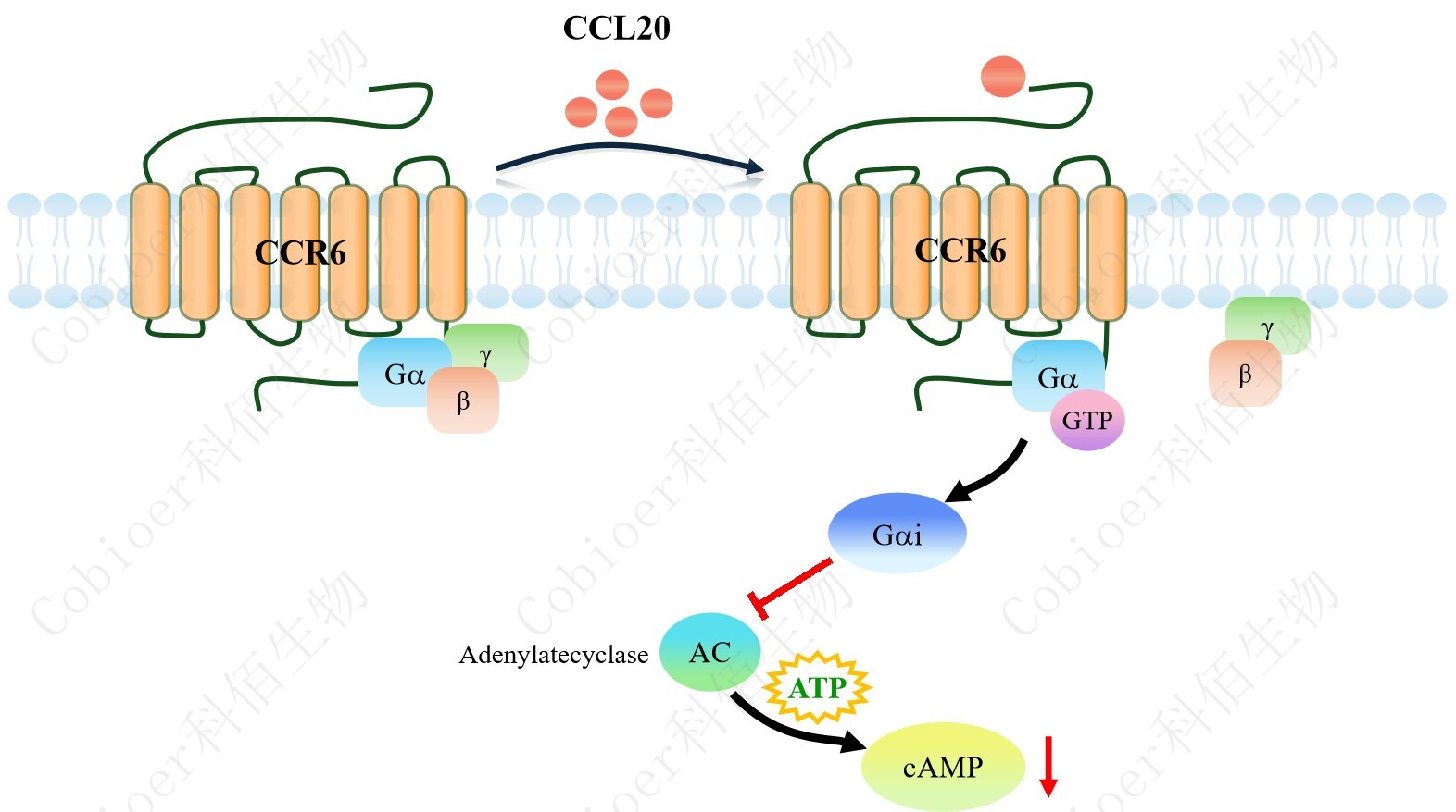 cAMP 在 G 蛋白偶聯(lián)受體(GPCR)信號(hào)轉(zhuǎn)導(dǎo)中是一種關(guān)鍵的第二信使。當(dāng)配體結(jié)合到 GPCR,構(gòu)象發(fā)生變化,激活受體接著激活 G 蛋白,Gi 的激活導(dǎo)致腺苷酸環(huán)化酶調(diào)控 cAMP 的下調(diào)。CCR6 藥靶模型很好的模擬了體內(nèi) CCR6 的信號(hào)轉(zhuǎn)導(dǎo)過程,原理見下圖所示。![]() Figure 1. CCR6 CHO 細(xì)胞模型原理圖 |