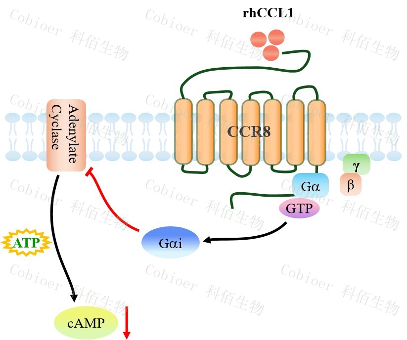 cAMP 在 G 蛋白偶聯(lián)受體(GPCR)信號(hào)轉(zhuǎn)導(dǎo)中是一種關(guān)鍵的第二信使。當(dāng)配體結(jié)合到 GPCR,構(gòu)象發(fā)生變化,激活受體接著激活 G 蛋白,Gi 的激活導(dǎo)致腺苷酸環(huán)化酶調(diào)控 cAMP 的下調(diào)。CCR8 藥靶模型很好的模擬了體內(nèi) CCR8 的信號(hào)轉(zhuǎn)導(dǎo)過(guò)程,原理見(jiàn)下圖所示。