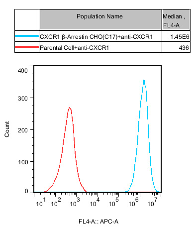 CXCR1 β-Arrestin CHO 報(bào)告基因藥靶模型很好的模擬了體內(nèi) CXCR1/β-Arrestin 的信號(hào)轉(zhuǎn)導(dǎo)過程,原理見下圖所示。當(dāng)缺乏配體刺激時(shí),β-Arrestin 不與 CXCR1 結(jié)合,融合β- Arrestin 的熒光素酶處于失活構(gòu)象,當(dāng) CXCR1 遭遇配體刺激時(shí),融合熒光素酶報(bào)告基因的 β-Arrestin 被招募,使熒光素酶報(bào)告基因處于激活狀態(tài),加入其底物后發(fā)光信號(hào)增強(qiáng)。![]() Figure 1. CXCR1 β-Arrestin CHO 細(xì)胞模型原理圖 |