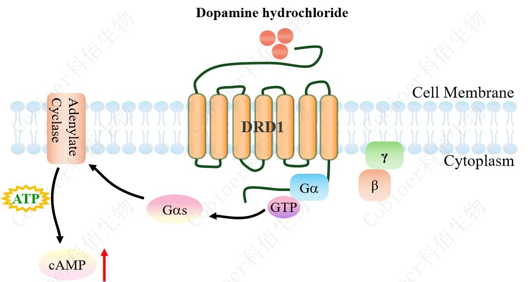 cAMP 在 G 蛋白偶聯(lián)受體(GPCR)信號轉(zhuǎn)導(dǎo)中是一種關(guān)鍵的第二信使。當(dāng)配體結(jié)合 到 GPCR,構(gòu)象發(fā)生變化,激活受體接著激活 G 蛋白,Gs 的激活導(dǎo)致腺苷酸環(huán)化酶調(diào)控 cAMP 的升高。DRD1 CHO 藥靶模型很好的模擬了體內(nèi) DRD1 的信號轉(zhuǎn)導(dǎo)過程,原理見下圖所示。