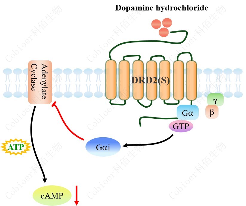 cAMP 在 G 蛋白偶聯(lián)受體(GPCR)信號(hào)轉(zhuǎn)導(dǎo)中是一種關(guān)鍵的第二信使。當(dāng)配體結(jié)合 到 GPCR,構(gòu)象發(fā)生變化,激活受體接著激活 G 蛋白,Gi 的激活導(dǎo)致腺苷酸環(huán)化酶調(diào)控 cAMP 的下調(diào)。DRD2 (S) CHO 藥靶模型很好的模擬了體內(nèi) DRD2 的信號(hào)轉(zhuǎn)導(dǎo)過程,原理見 下圖所示。