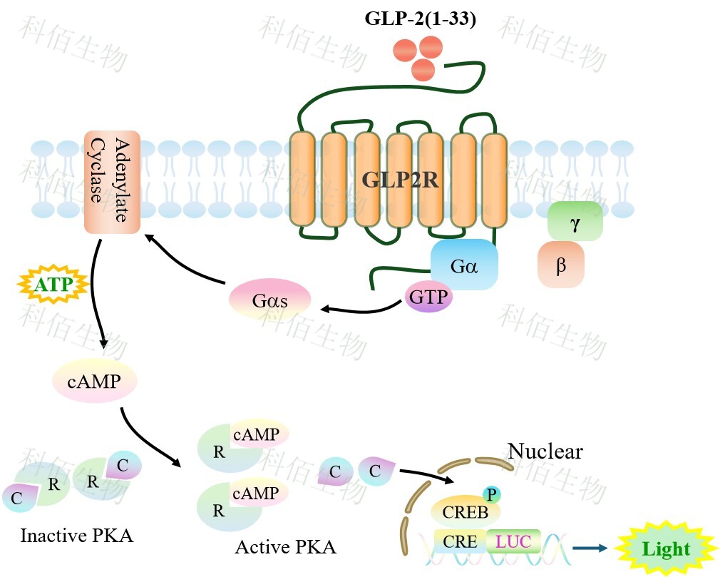 GLP2R CRE-Luc HEK293 報(bào)告基因藥靶模型很好的模擬了體內(nèi) GLP2R 的信號轉(zhuǎn)導(dǎo)過程,原理見下圖所示。
