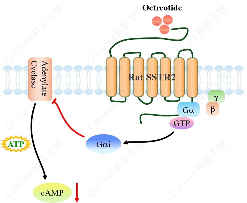 | 生長抑素受體(Somatostatin receptor,SSTRs)是 GPCR 超家族中的 class A 家族的成 員,共有 5 種亞型,分別為 SSTR1-SSTR5,其中 SSTR2 是唯一一種有 SSTR2a 和 SSTR2b 這 2 種異構(gòu)體的 SSTR 亞型受體蛋白。SSTR2 廣泛分布于正常組織中,如腦下垂體、胰島、 腎上腺、胸腺、胃腸道以及免疫系統(tǒng)等,在不同受體的組織,表達(dá)譜各不相同。 SSTR2 與其它同家族受體一樣,在結(jié)合內(nèi)源性多肽配體 SST 后可以與 Gi 蛋白偶聯(lián), 通過調(diào)節(jié)腺苷酸環(huán)化酶活性進(jìn)而抑制環(huán)腺苷酸的合成,將外源信號(hào)傳遞至胞內(nèi),從而參與 調(diào)節(jié)多種激素的分泌,抑制細(xì)胞生長增殖。SSTR 還能激活 K+通道,促進(jìn)細(xì)胞膜超極化, 抑制門控 Ca 2+通道的激活,進(jìn)而阻礙 Ca 2+ 內(nèi)流,抑制胞吐,抑制荷爾蒙的分泌功能。當(dāng) SSTR2 或其它亞型與 SST 結(jié)合后,可以通過蛋白酪氨酸磷酸途徑,SSTR 導(dǎo)致蛋白酪氨酸 磷酸酶(PTP)上調(diào),使酪氨酸激酶去磷酸化而失活,并抑制促絲裂原活化蛋白激酶 (MAPK)等多種蛋白激酶,抑制癌基因、c-fos、c-mys、c-jun 等轉(zhuǎn)錄激活,從而抑制 DNA 和蛋白質(zhì)的合成。SSTR2 在神經(jīng)母細(xì)胞瘤、垂體腺瘤、黑色素瘤、甲狀腺癌以及許多 神經(jīng)內(nèi)分泌腫瘤中高表達(dá)。 |