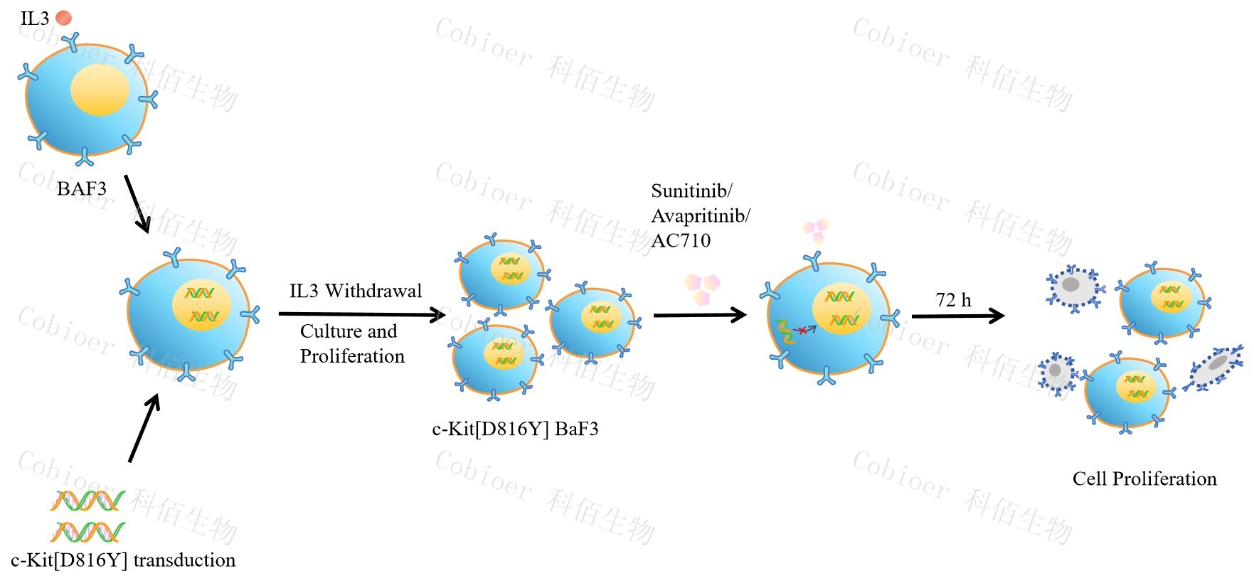 BaF3(小鼠原 B 細胞)的生長和增殖需要 IL-3 的維持。通過引入各種表達激酶的基因,能作為 BaF3 的驅動基因,讓 BaF3 不再依賴 IL-3 而增殖,進而激酶基因成為 BaF3 增殖依賴的驅動基因,用于評估小分子藥物對激酶的靶向抑制作用,原理及流程見下圖所示。 ![]() Figure 1. c-Kit[D816Y] BaF3 細胞的構建原理圖 |