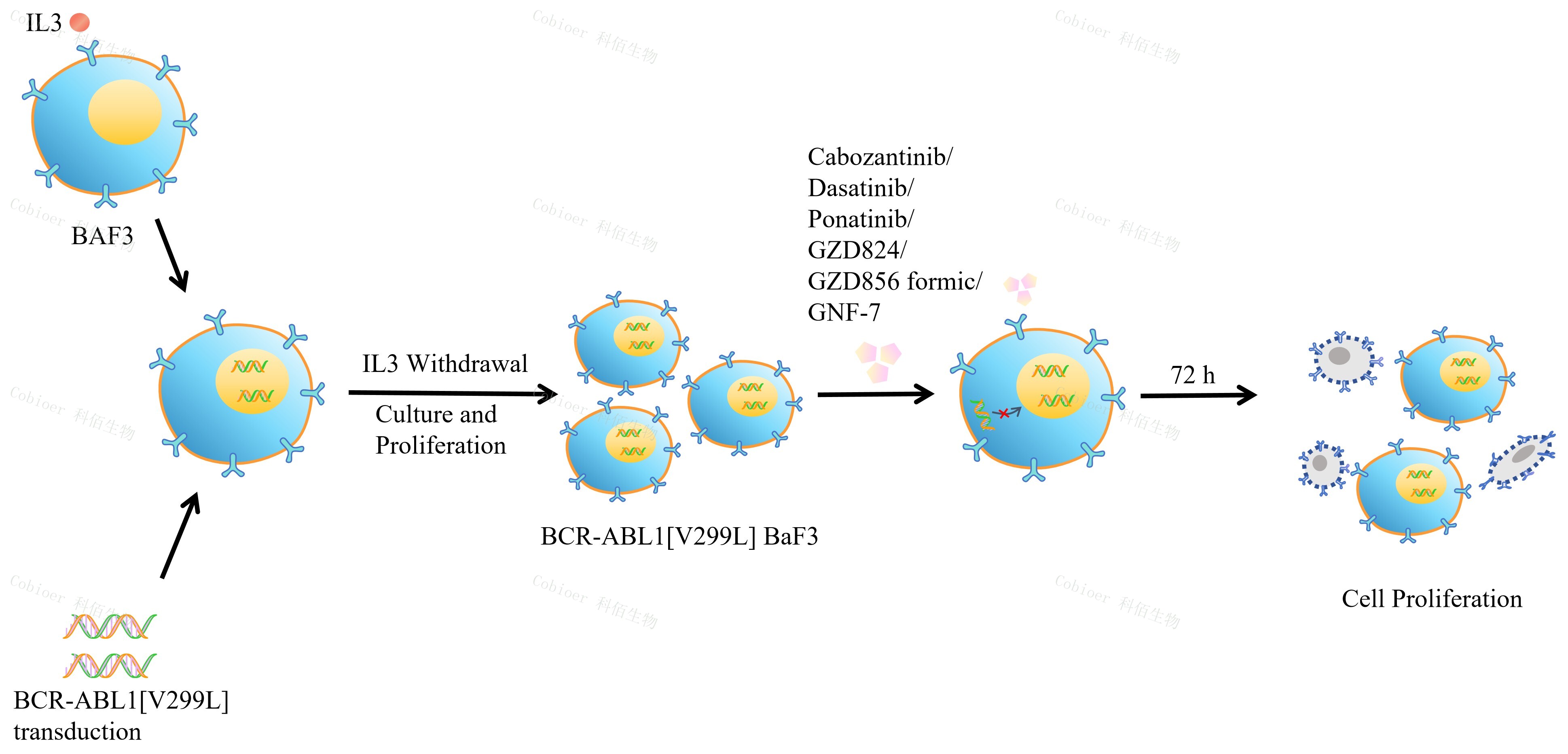 | BCR-ABL1[V299L] BaF3 藥靶細(xì)胞 , 通過轉(zhuǎn)導(dǎo)突變狀態(tài)的 BCR- ABL1[V299L]基因到 BaF3 細(xì)胞系中,穩(wěn)定表達(dá)人突變形態(tài)下的 BCR-ABL1[V299L]基因。 BaF3(小鼠原 B 細(xì)胞)的生長和增殖需要 IL-3 的維持。通過引入各種表達(dá)激酶的基因, 能作為 BaF3 的驅(qū)動基因,讓 BaF3 不再依賴 IL-3 而增殖,進(jìn)而激酶基因成為 BaF3 增殖依賴的驅(qū)動基因,用于評估小分子藥物對激酶的靶向抑制作用,原理及流程見下圖所示。 ![]() Figure 1. BCR-ABL1[V299L] BaF3 細(xì)胞的構(gòu)建原理圖 |