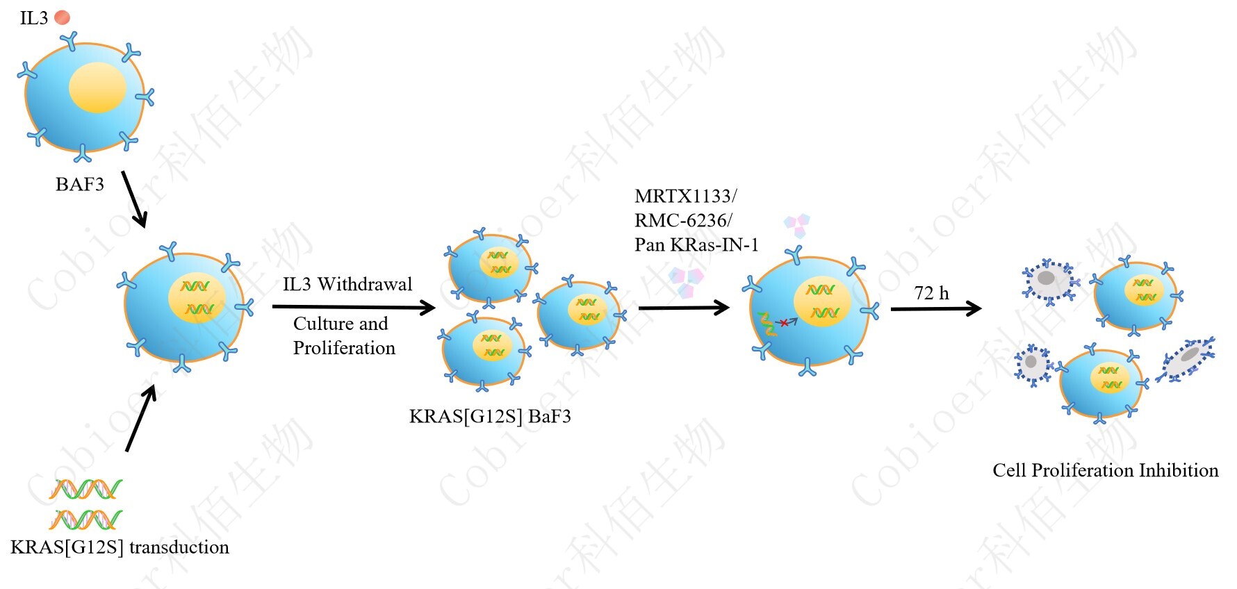 BaF3(小鼠原 B 細胞)的生長和增殖需要 IL-3 的維持。通過引入各種表達激酶的基因, 能作為 BaF3 的驅(qū)動基因,讓 BaF3 不再依賴 IL-3 而增殖,進而激酶基因成為 BaF3 增殖依 賴的驅(qū)動基因,用于評估小分子藥物對激酶的靶向抑制作用,原理及流程見下圖所示。
