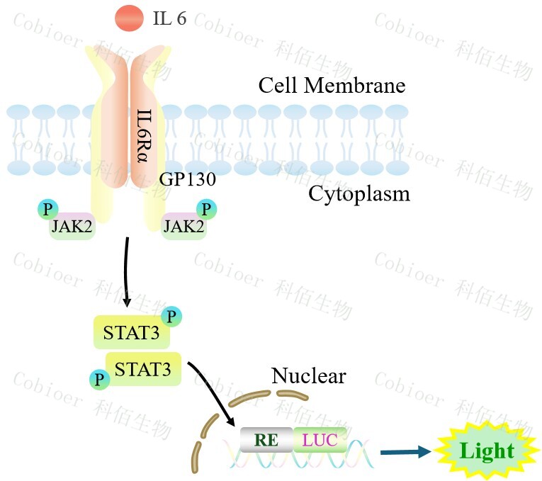 STAT3-Luc HEK293 報告基因細胞,是由 STAT3 調(diào)控并表達 Luc 熒光素 酶報告基因的 HEK293 細胞。IL6 細胞因子與受體復(fù)合物結(jié)合,啟動 JAK/STAT3 信號通路,原理見下圖所示。