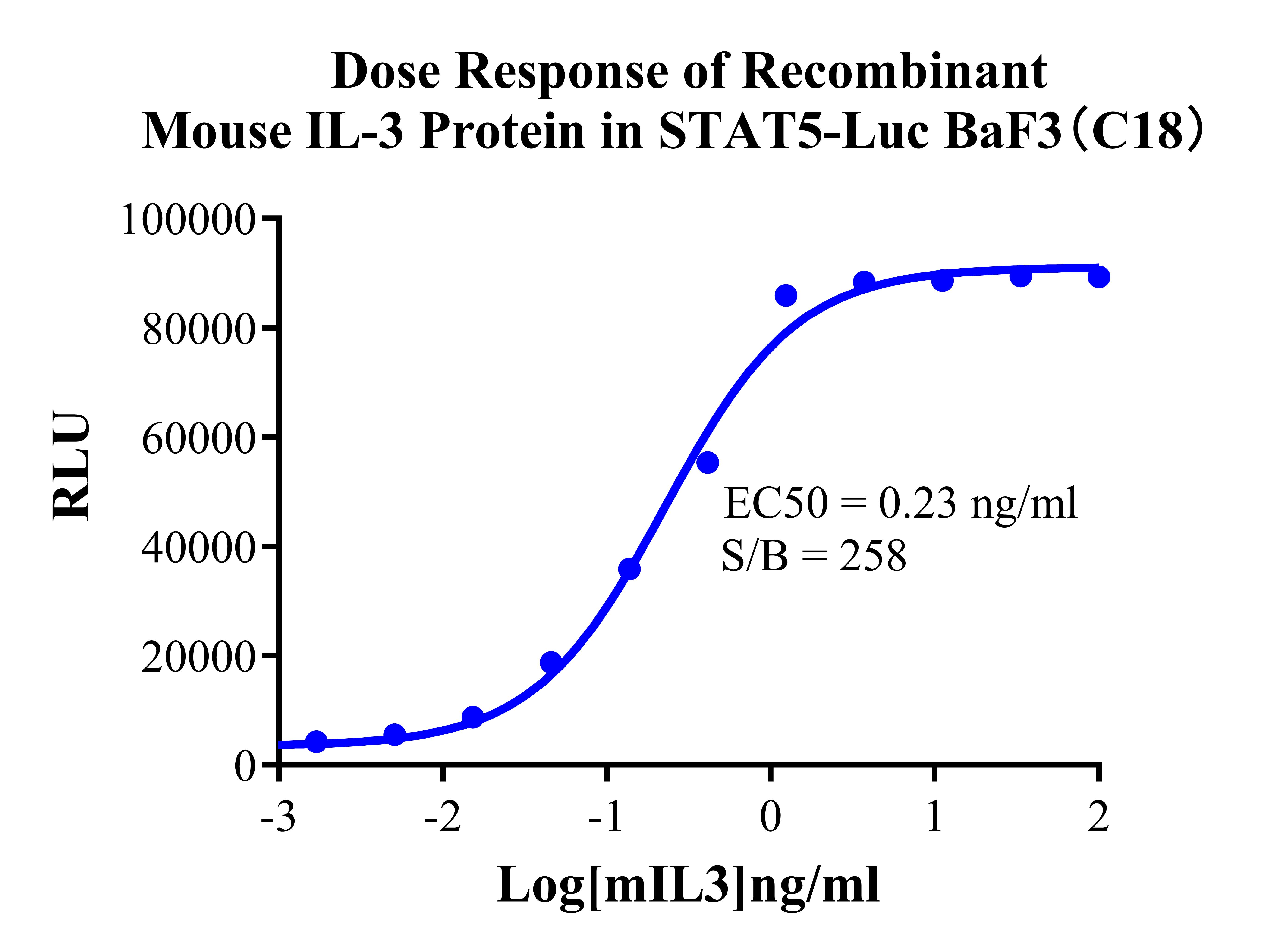 Figure 2.Detect Luciferase assay by Ultra Luciferase Detection Kit CBPH0001(we strongly suggest to purchase from Cobioer). Dose Response of  Recombinant Mouse IL-3 Protein in STAT5-Luc BaF3(C18).