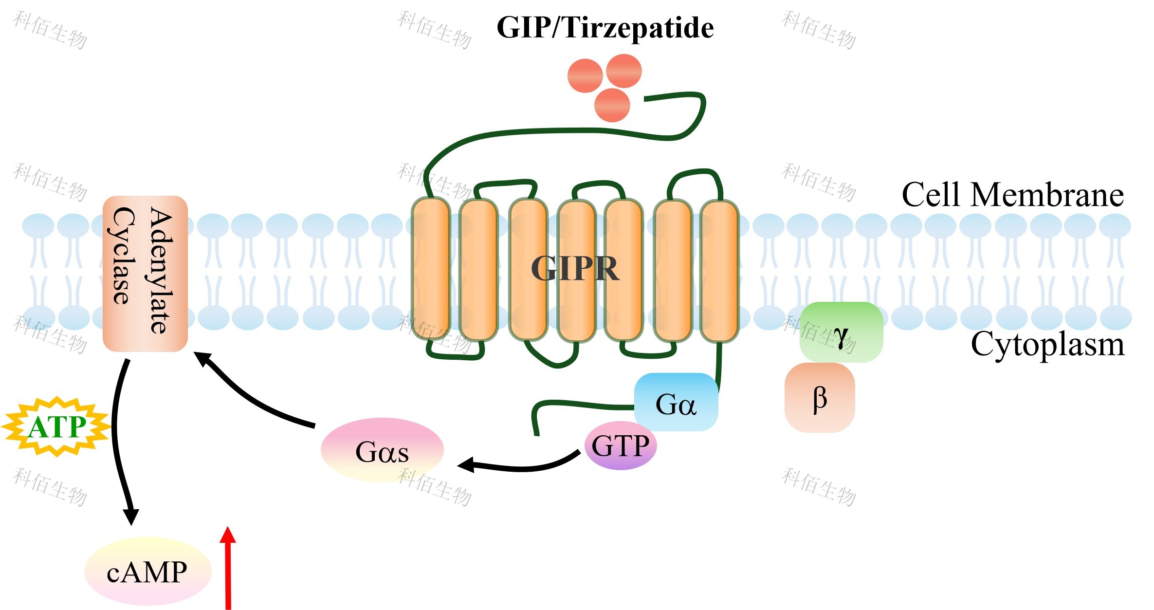cAMP 在 G 蛋白偶聯(lián)受體(GPCR)信號(hào)轉(zhuǎn)導(dǎo)中是一種關(guān)鍵的第二信使。當(dāng)配體結(jié)合到 GPCR,構(gòu)象發(fā)生變化,激活受體接著激活G蛋白,Gs的激活導(dǎo)致腺苷酸環(huán)化酶調(diào)控cAMP 的升高。GIPR 藥靶模型很好的模擬了體內(nèi) GIPR 的信號(hào)轉(zhuǎn)導(dǎo)過程,原理見下圖所示。