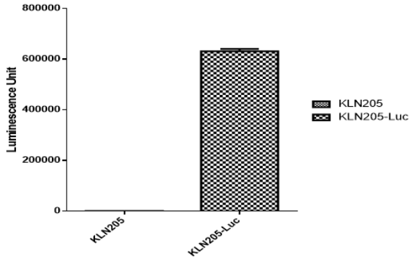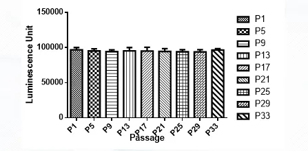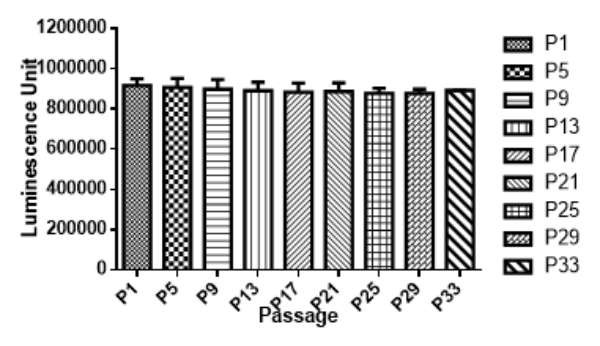 4. 示蹤細(xì)胞體外發(fā)光測試,測定發(fā)光信號(hào)強(qiáng)度和細(xì)胞傳代信號(hào)穩(wěn)定性,確保示蹤細(xì)胞在體外和體內(nèi)都能穩(wěn)定高水平表達(dá)標(biāo)記蛋白,以科佰生物A549-Luc細(xì)胞為例: