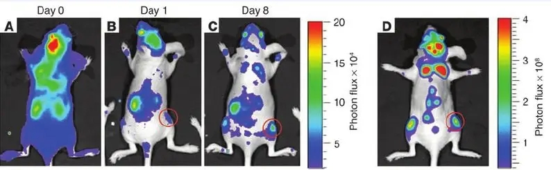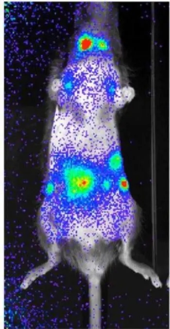 2.腫瘤轉(zhuǎn)移:由于活體成像技術(shù)直觀、靈敏度高的特點(diǎn),成為研究腫瘤轉(zhuǎn)移的重要手段。動(dòng)物體內(nèi)腫瘤轉(zhuǎn)移示例: