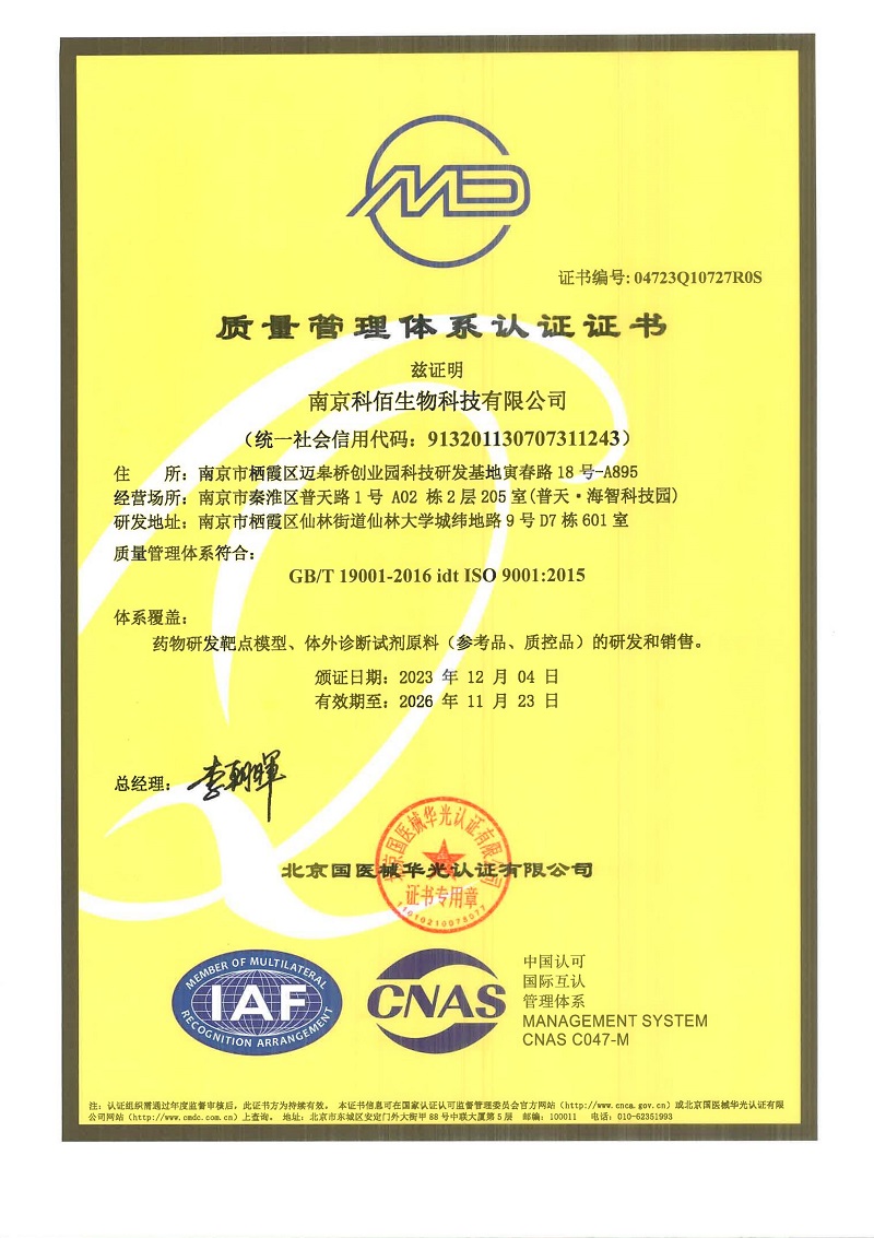 ISO 9001:2015 認證范圍:藥物研發(fā)靶點模型、體外診斷試劑原料(參考品、質(zhì)控品) 的研發(fā)和銷售。