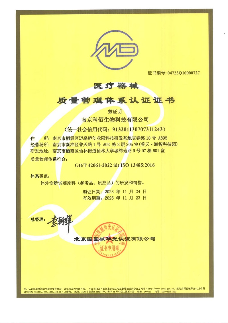 ISO 13485:2016 認證范圍:體外診斷試劑原料(參考品、質(zhì)控品) 的研發(fā)和銷售。