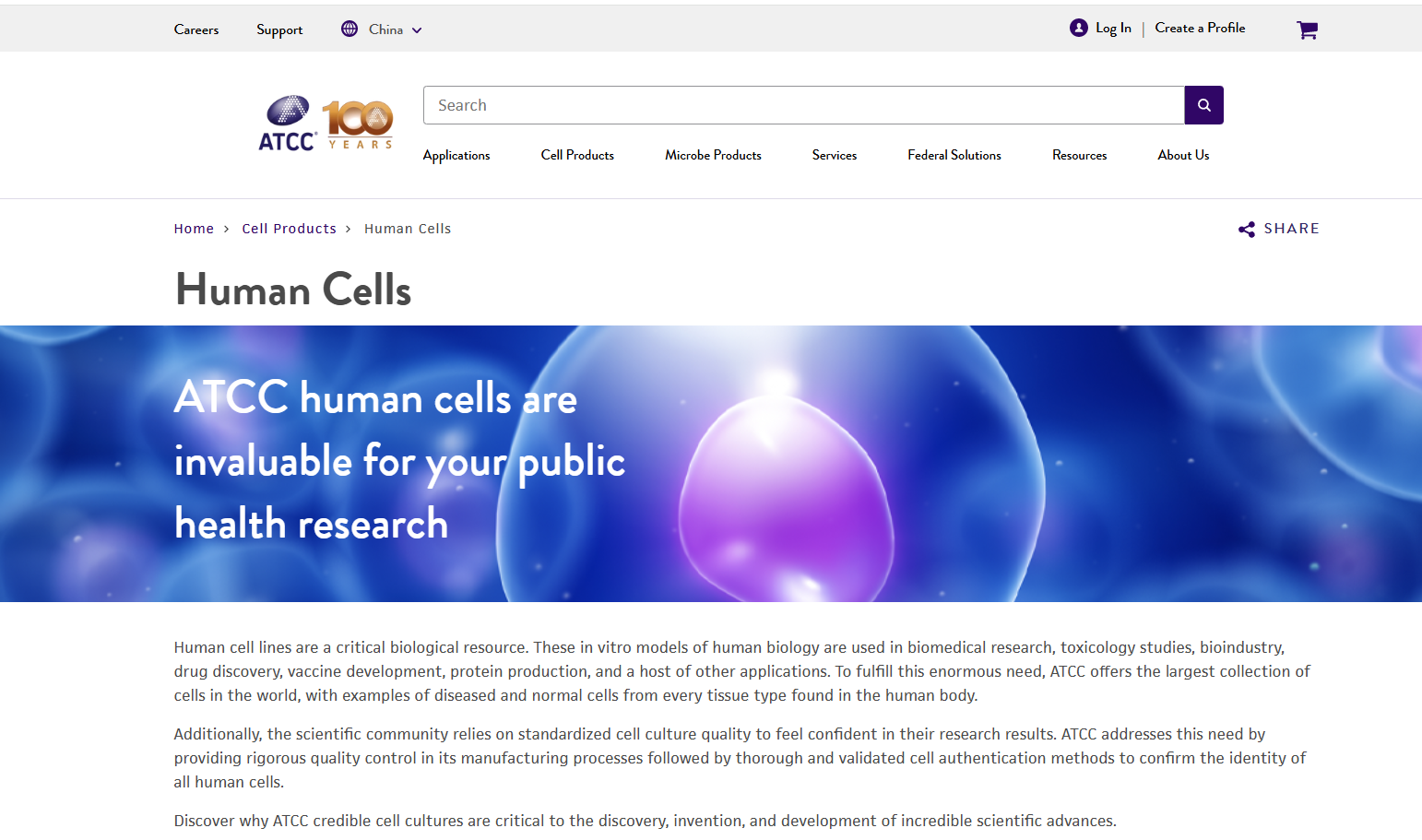 ATCC (American Type Culture Collection) 非營(yíng)利性的全球生物資源中心和標(biāo)準(zhǔn)組織,也是認(rèn)證細(xì)胞系和微生物的領(lǐng)先開發(fā)商和供應(yīng)商,擁有世界上最大、最廣泛的人類和動(dòng)物研究細(xì)胞系產(chǎn)品目錄,主要提供各種細(xì)胞系、微生物株、原代細(xì)胞、基因組和其他生物材料。它包含了數(shù)千種細(xì)胞系,包括人類、動(dòng)物和昆蟲的細(xì)胞系。常見的類型包括癌癥細(xì)胞系、免疫細(xì)胞、干細(xì)胞、以及轉(zhuǎn)基因細(xì)胞系。且細(xì)胞系數(shù)據(jù)中包含了詳細(xì)的細(xì)胞表征信息,如形態(tài)學(xué)、分子標(biāo)記、基因表達(dá)譜、增殖能力、傳代歷史等。它所提供的細(xì)胞形態(tài)圖是國(guó)際公認(rèn)的細(xì)胞標(biāo)準(zhǔn),大多數(shù)研究學(xué)者在購買細(xì)胞后都會(huì)與ATCC數(shù)據(jù)庫中的細(xì)胞圖片作對(duì)照。