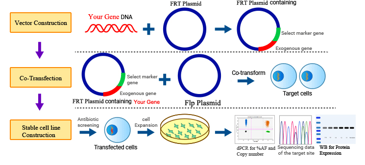Flp-FRT整合系統(tǒng)是一種用于構(gòu)建穩(wěn)定細(xì)胞系的方法,該細(xì)胞系可在宿主細(xì)胞基因組的特定位置表達(dá)目的基因。該系統(tǒng)利用 Flp 重組酶和 FRT(Flp 重組靶位)位點(diǎn)實(shí)現(xiàn)位點(diǎn)特異性重組和整合。該系統(tǒng)可實(shí)現(xiàn)目的基因的穩(wěn)定表達(dá),確保細(xì)胞中蛋白質(zhì)的持續(xù)生產(chǎn)。