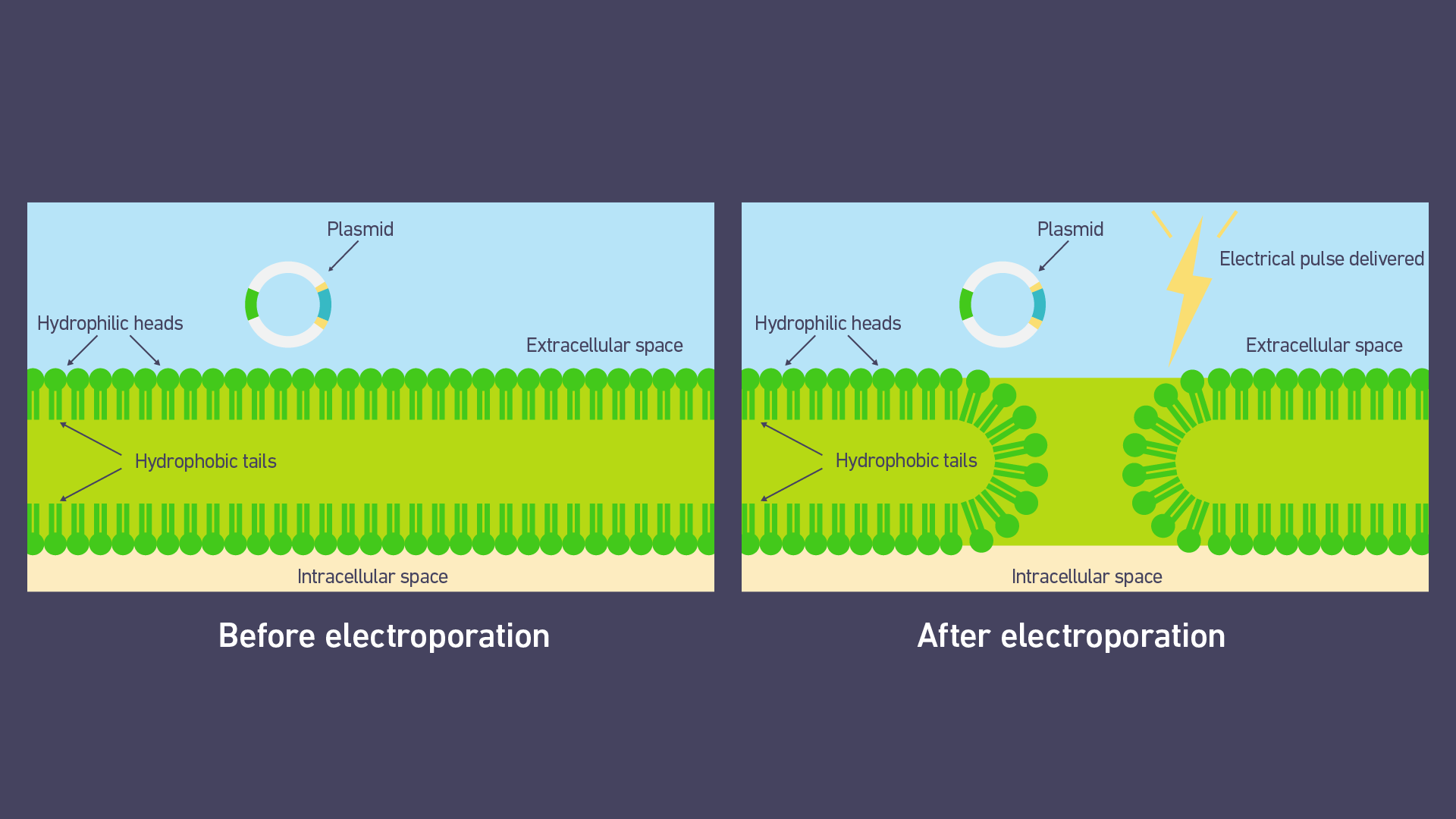 電脈沖擾亂細(xì)胞膜的磷脂雙層,從而形成孔隙(圖 2)。這種過程是不對稱的,孔隙首先在細(xì)胞的陽極側(cè)形成。同時,跨膜電位增加。這驅(qū)使帶電分子(例如質(zhì)粒DNA)首先吸附到細(xì)胞陰極側(cè)的膜上,然后穿過這些孔隙進(jìn)入細(xì)胞 (圖 3)。
