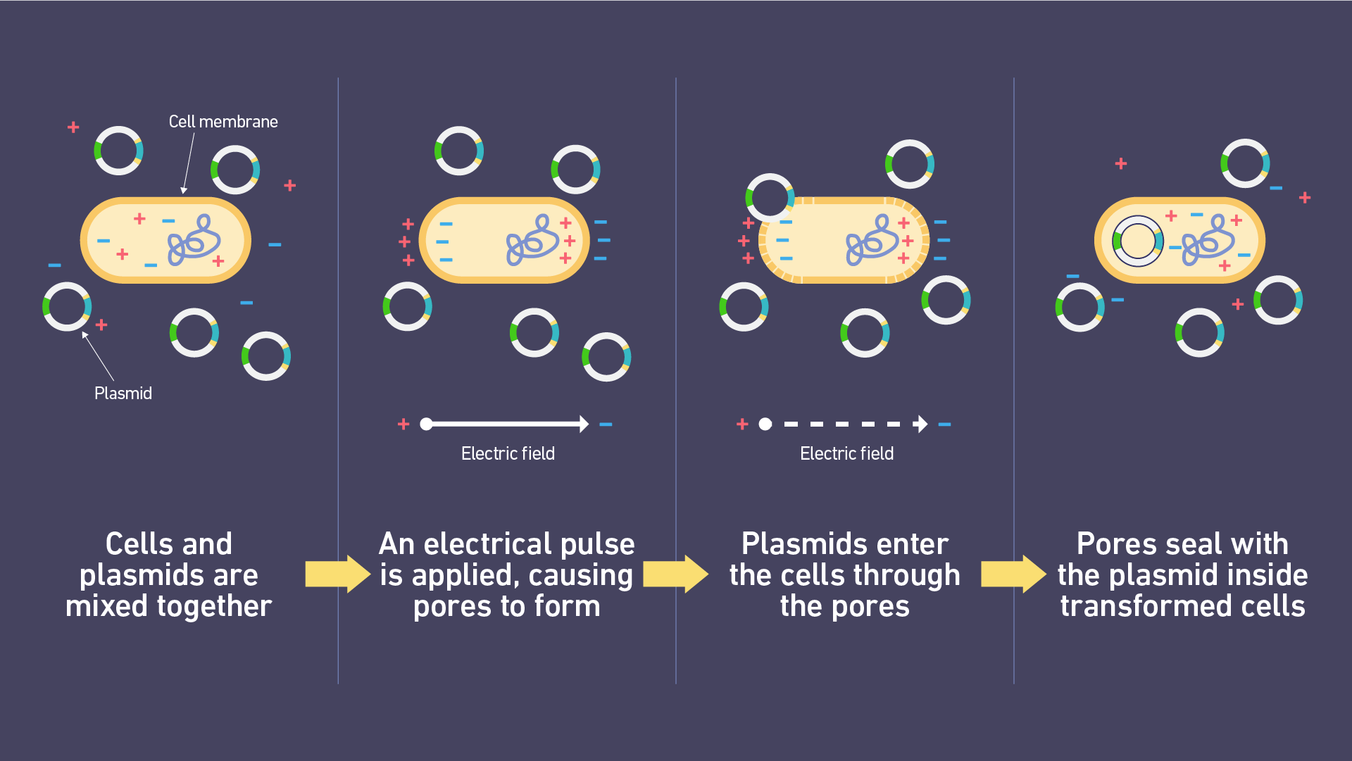 圖3:示意圖顯示了電穿孔過程中將外源物質(zhì)(在本例中為質(zhì)粒)引入細(xì)胞的步驟和相關(guān)電荷。圖片來源:Technology Networks。