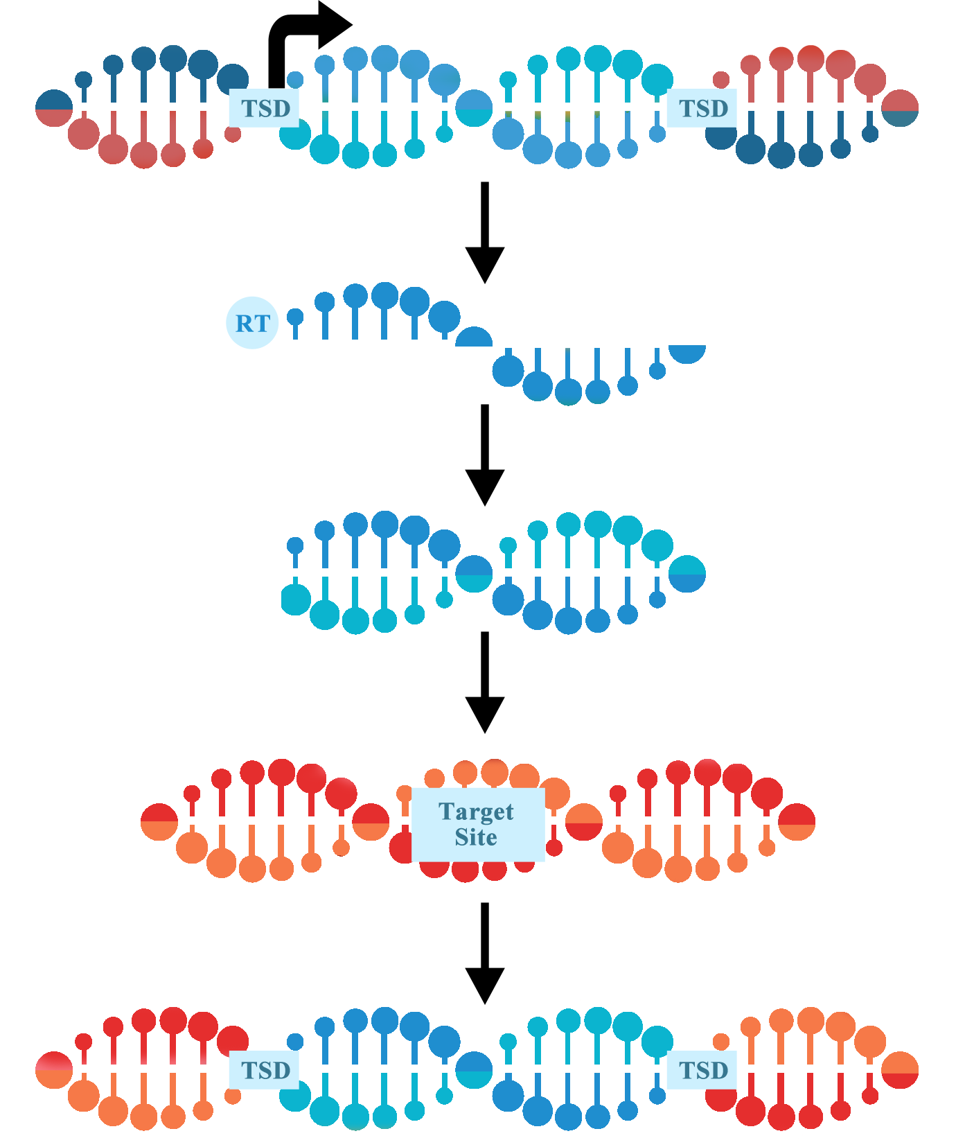 圖 1:逆轉(zhuǎn)錄轉(zhuǎn)座子轉(zhuǎn)座概述。逆轉(zhuǎn)錄轉(zhuǎn)座子通過“復(fù)制粘貼Ctrl C+V”機制進行移動。