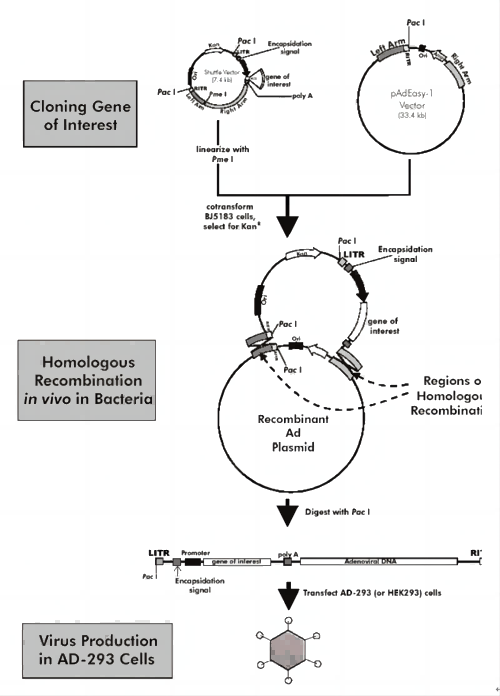 AdEasy包裝系統(tǒng)主要的特點是利用Cre/loxP系統(tǒng)在大腸桿菌(BJ5183)中完成外源基因插入腺病毒基因組的過程,獲得環(huán)狀的重組腺病毒基因組,并且具有在細(xì)菌中復(fù)制的必需元件。將重組腺病毒基因組酶切線性化后轉(zhuǎn)染HEK293細(xì)胞,避免了雙質(zhì)粒共轉(zhuǎn)染得到重組腺病毒。