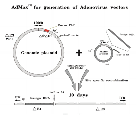 AdMax包裝系統(tǒng)是通過Cre/loxP 獲得重組病毒,這個過程發(fā)生在HEK293細(xì)胞中,從而避免在細(xì)菌中重組。將克隆了外源基因的腺病毒穿梭質(zhì)粒與攜帶了腺病毒大部分基因組的包裝質(zhì)粒共轉(zhuǎn)染HEK293細(xì)胞,利用Cre/loxP系統(tǒng)的作用實現(xiàn)重組,產(chǎn)生重組腺病毒。這個系統(tǒng)有多種優(yōu)勢,包括操作簡便、重組效率高、獲得的病毒產(chǎn)率高、目的基因的表達水平高(因為mCMV啟動子比hCMV啟動子強若干倍)等。