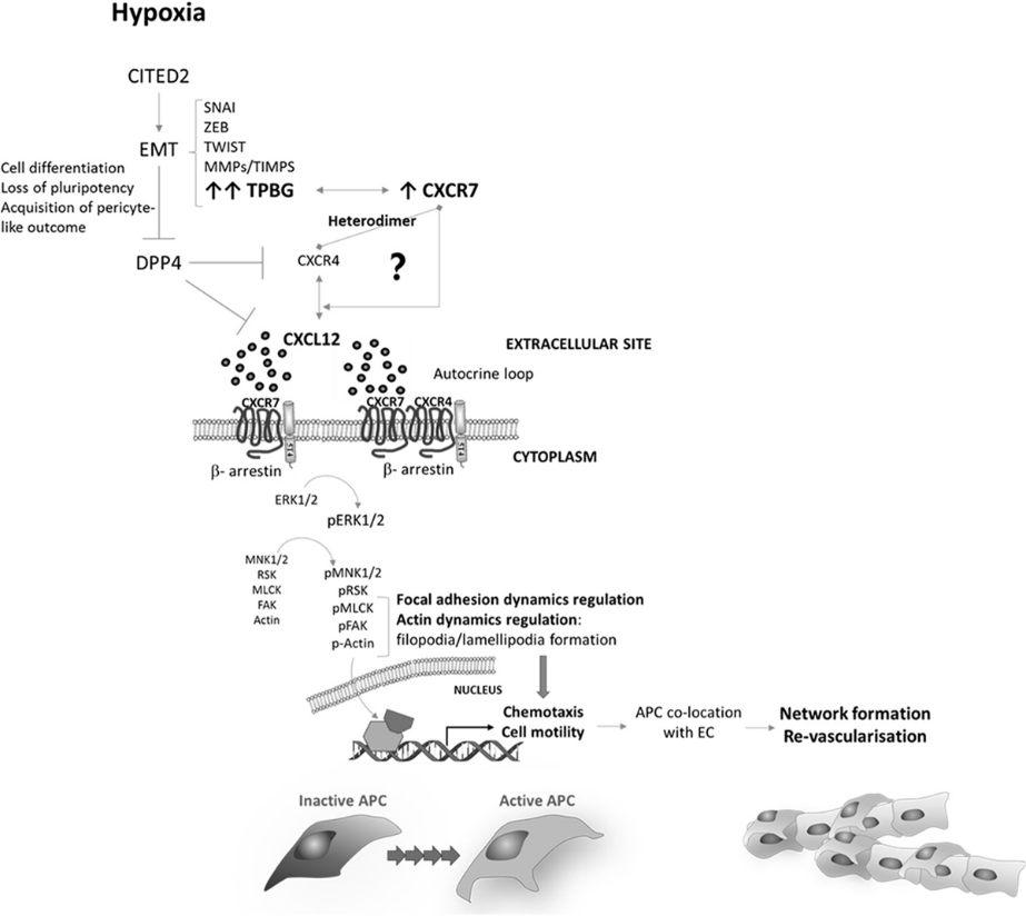 CXCL12和CXCR4表達(dá)與許多腫瘤的發(fā)生有關(guān),有研究表明CXCR4的表達(dá)有助于癌細(xì)胞擴(kuò)散到CXCL12高表達(dá)的組織中,比如肺、肝、淋巴結(jié)和骨髓。在小鼠胚胎干細(xì)胞、成纖維細(xì)胞和癌細(xì)胞中,TPBG的上調(diào)與CXCL12的誘導(dǎo)有關(guān)。TPBG通過抑制負(fù)責(zé)CXCL12裂解的蛋白酶DPP4來延長CXCL12的生物利用度。CXCL12通過結(jié)合CXCR4以及非典型CXCR7和CXCR4/CXCR7異源二聚體觸發(fā)細(xì)胞內(nèi)信號傳導(dǎo)。CXCR4和CXCR7也可以與β-arrestin-2形成復(fù)合物,從而促進(jìn)受體內(nèi)化并將信號重定向到其他不依賴G蛋白的途徑如p38 MAPK/ERK 信號通路。在某種程度上說明5T4可通過CXCR4/CXCL12通路來影響腫瘤細(xì)胞的發(fā)生、發(fā)展、轉(zhuǎn)移等。