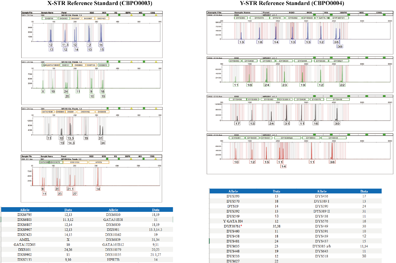 X染色體標準品包含19個X-STR基因座和一個性別位點Amelogenin。Y染色體標準品包含22個低頻突變Y-STR基因座和7個高頻突變Y-STR基因座。低頻突變和高頻突變基因座相結(jié)合具有更高的個體識別能力,提供了強大的兼容性和排查能力。