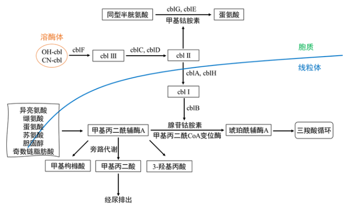 甲基丙二酸是異亮氨酸、纈氨酸、甲硫氨酸、蘇氨酸、膽固醇和奇數(shù)鏈脂肪酸分解代謝途徑中甲基丙二酰輔酶A的代謝產(chǎn)物,正常情況下,在甲基丙二酰輔酶A變位酶及腺苷鈷胺素的作用下轉(zhuǎn)化成琥珀酰輔酶A,參與三羧酸循環(huán)。具體發(fā)病機制見下圖:
