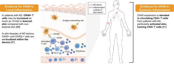 有研究證明OX40通路的激活參與了AD患者的全身和局部炎癥(如下圖所示)。雖然OX40L的表達(dá)(主要是單核細(xì)胞)在AD患者和健康對照組之間沒有差異,但在AD患者循環(huán)CD4+ T細(xì)胞中OX40的表達(dá)升高。在AD患者的外周血中,活化的CD4+ T細(xì)胞上OX40的表達(dá)比未表達(dá)抗原的活化CD4+ T細(xì)胞上OX40的表達(dá)增加。AD患者病變皮膚中OX40+細(xì)胞(可能是T細(xì)胞)和OX40L+樹突狀細(xì)胞的數(shù)量比銀屑病和非病變皮膚多。一項研究表明,在AD患者中,皮損皮膚中OX40+ T細(xì)胞比非皮損皮膚增加了10倍之多。在AD病變的皮膚活檢中,發(fā)現(xiàn)OX40+真皮細(xì)胞和OX40L+細(xì)胞(可能是肥大細(xì)胞)在真皮內(nèi)共定位,在角質(zhì)形成細(xì)胞上可見OX40L的表達(dá),提示OX40信號的局部活性。