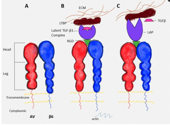 整合素αvβ6特異的配體主要配體包括細(xì)胞外基質(zhì)蛋白如纖維連接蛋白(Fibronectin)、層粘連蛋白(Laminin)以及潛活形式的TGF-β。潛伏期相關(guān)肽(LAP)是轉(zhuǎn)化生長(zhǎng)因子β(TGF-β)前體肽的氨基末端結(jié)構(gòu)域,形成潛在的 TGF-β 復(fù)合物,并充當(dāng)整合素 αvβ6 的配體。當(dāng)整合素 αvβ6 通過(guò)LAP與細(xì)胞外位點(diǎn)的潛在TGF-β復(fù)合物結(jié)合時(shí),同時(shí)與細(xì)胞內(nèi)細(xì)胞骨架結(jié)合時(shí),活性TGF-β從潛在復(fù)合物中釋放出來(lái),驅(qū)動(dòng)纖維化和免疫抑制微環(huán)境形成;此外,αvβ6還可作為口蹄疫病毒(FMDV)等病原體的入侵受體。