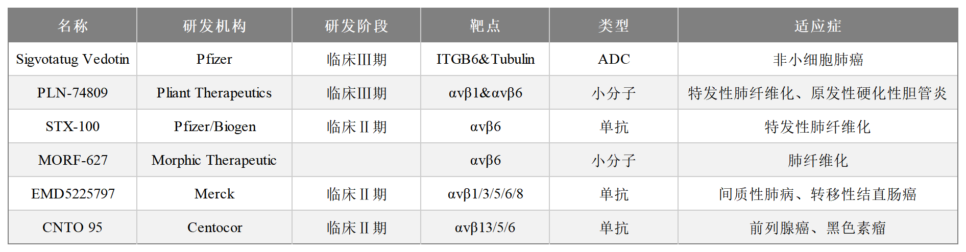 2025年JPM大會(huì)上,Pfizer 公布其Sigvotatug Vedotin(SGN-B6A)在非小細(xì)胞肺癌患者中良好的抗腫瘤活性和初步的療效,特別是在未接受過(guò)紫杉烷治療的非鱗狀NSCLC患者中,其療效更為顯著。整合素αvβ6作為纖維化和腫瘤治療的潛力靶點(diǎn),近年來(lái)藥物研發(fā)進(jìn)展迅速,涵蓋單抗、小分子、ADC及基因療法等領(lǐng)域。