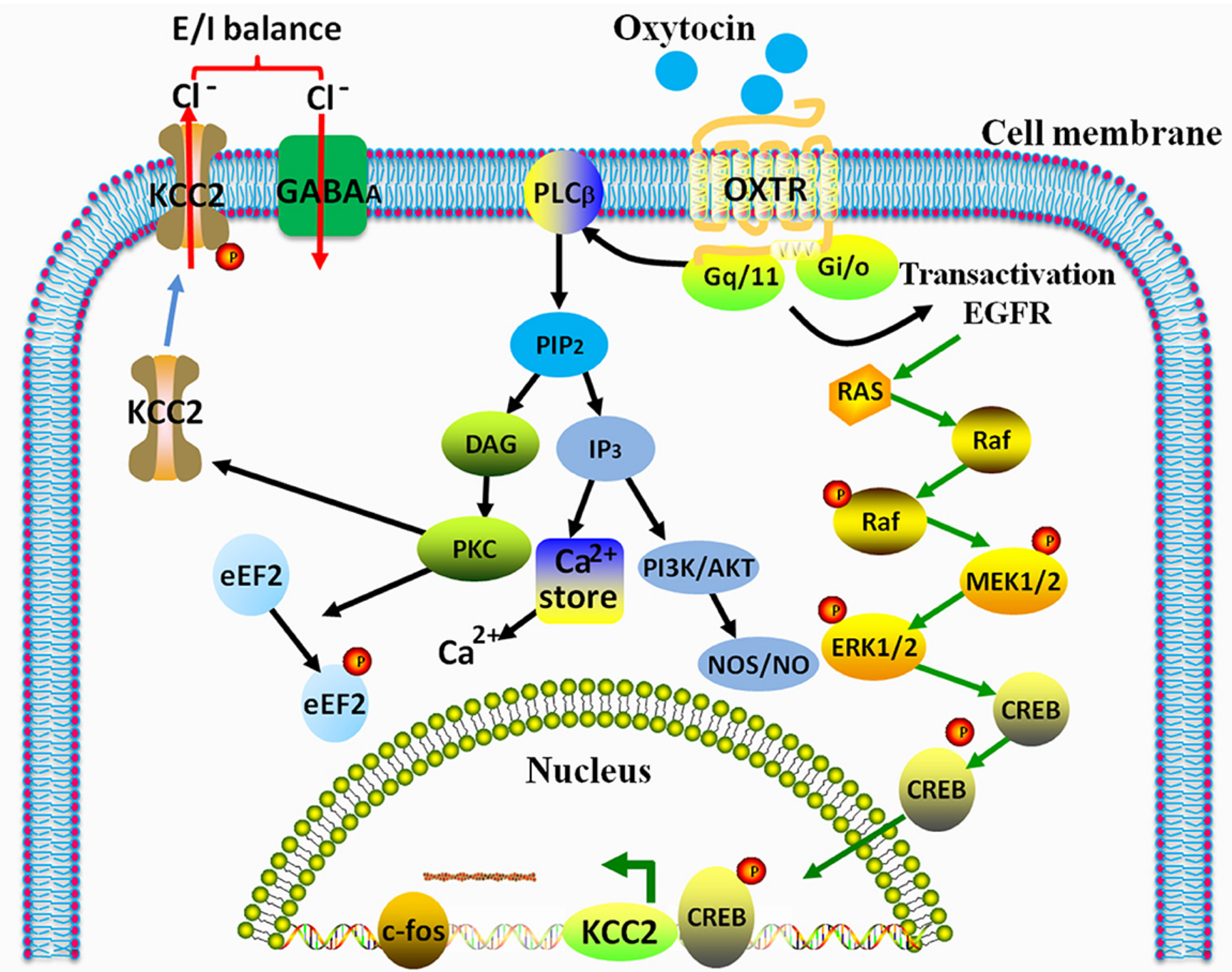 催產(chǎn)素(OXT)是大腦中由下丘腦室旁核(PVN)和視上核(SON)產(chǎn)生的神經(jīng)肽,主要作為外周系統(tǒng)中的激素,可促進(jìn)母乳喂養(yǎng)時(shí)的乳汁分泌,調(diào)節(jié)分娩時(shí)的子宮收縮,緩解疼痛和促進(jìn)分娩過(guò)程,促進(jìn)傷口愈合。此外,中樞神經(jīng)系統(tǒng)(CNS)中的 OXT 系統(tǒng)在社會(huì)認(rèn)可、社交行為、焦慮相關(guān)行為和自主神經(jīng)功能中起著重要作用,例如母體行為、攻擊性、交配、依戀和性行為。除了促社會(huì)效應(yīng)外,OXT 還被確定為大腦中重要的抗應(yīng)激和抗焦慮因子,通過(guò)其靶受體(催產(chǎn)素受體,OXTR)激活細(xì)胞內(nèi) MEK/ERK 信號(hào)傳導(dǎo)。