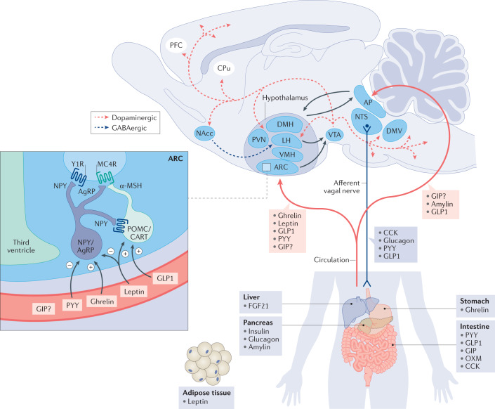 MC4R (黑皮質(zhì)素4受體) 是黑皮質(zhì)素受體家族成員之一,其家族屬于視紫紅質(zhì)樣A類GPCR,成員還包括:MC1R、MC2R、MC3R和MC5R。黑皮質(zhì)素受體 (MC1R-MC5R) 位于多種細胞類型上,并遍布大多數(shù)身體系統(tǒng)。MC4R是中樞黑皮質(zhì)素系統(tǒng)的重要組成部分,主要在下丘腦室旁核(PVH)中表達,是一種A類GPCR。在高能量平衡狀態(tài)下,阿片黑皮質(zhì)素原 (POMC) 神經(jīng)元釋放多肽MC4R激動劑-α-黑素細胞刺激激素(α-MSH)。α- MSH與MC4R結(jié)合會激活MC4R信號傳導,抑制食欲和食物攝入。在低能量平衡狀態(tài)下,下丘腦室旁核中釋放AgRP (agouti-related peptide)。AgRP作為MC4R與α- MSH結(jié)合的競爭性拮抗劑,也是MC4R反向激動劑,抑制MC4R信號傳導。