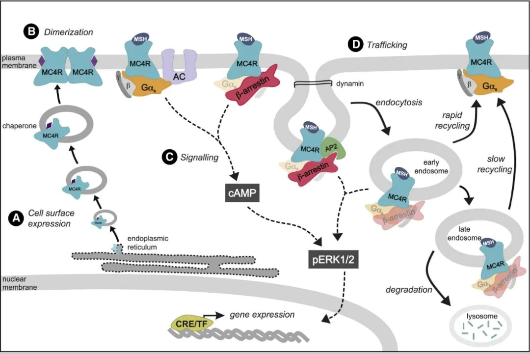 MC4R涉及的信號通路主要包括瘦素(Leptin)-黑皮質(zhì)素通路、G蛋白信號通路、β-ARRESTIN通路和Ca2+調(diào)節(jié)途徑。這些信號通路都與肥胖和能量代謝相關(guān)。