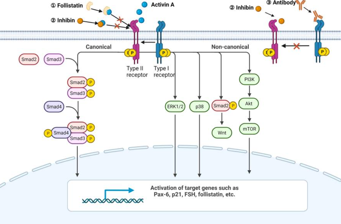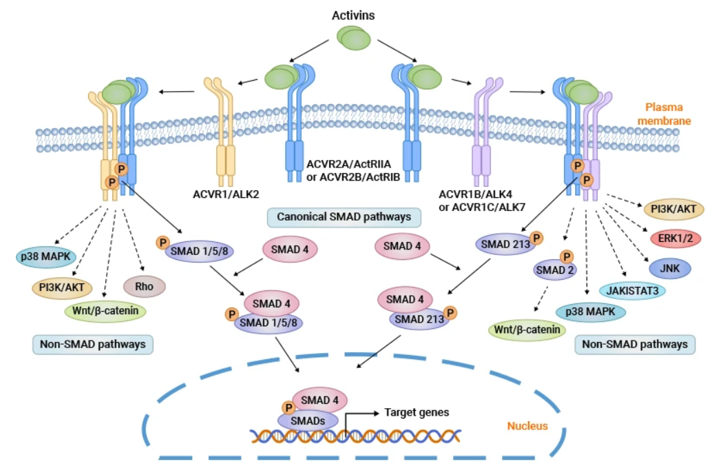 激活素A首先結(jié)合并促進(jìn)ActRII的磷酸化,然后招募I型受體形成磷酸化多聚體。激活的受體復(fù)合物磷酸化SMAD2 和 SMAD3蛋白,磷酸化后的smad2/3與smad4蛋白結(jié)合成三聚體并易位到細(xì)胞核中調(diào)控相關(guān)基因的轉(zhuǎn)錄。