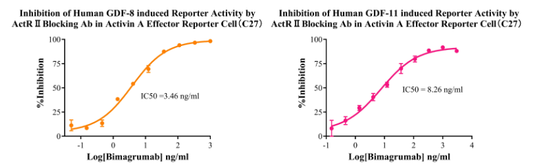 Figure 4Inhibition of Human GDF-8 induced Reporter Activity by ActR II Blocking Ab in Activin A Effector Reporter Cell(C27). Inhibition of Human GDF-11 induced Reporter Activity by ActR II Blocking Ab in Activin A Effector Reporter Cell(C27).