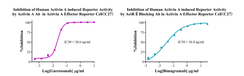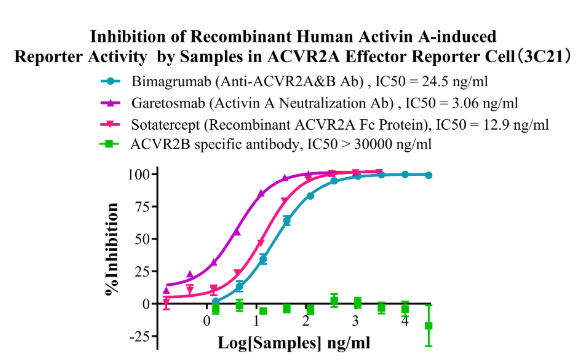 為助力ActRⅡ靶點(diǎn)藥物研發(fā),南京科佰開發(fā)了Activin A Effector Reporter Cell、ACVR2A CHO、ACVR2A Effector Reporter Cell、ACVR2B CHO和ACVR2B Effector Reporter Cell細(xì)胞篩選模型,部分?jǐn)?shù)據(jù)展示如下: